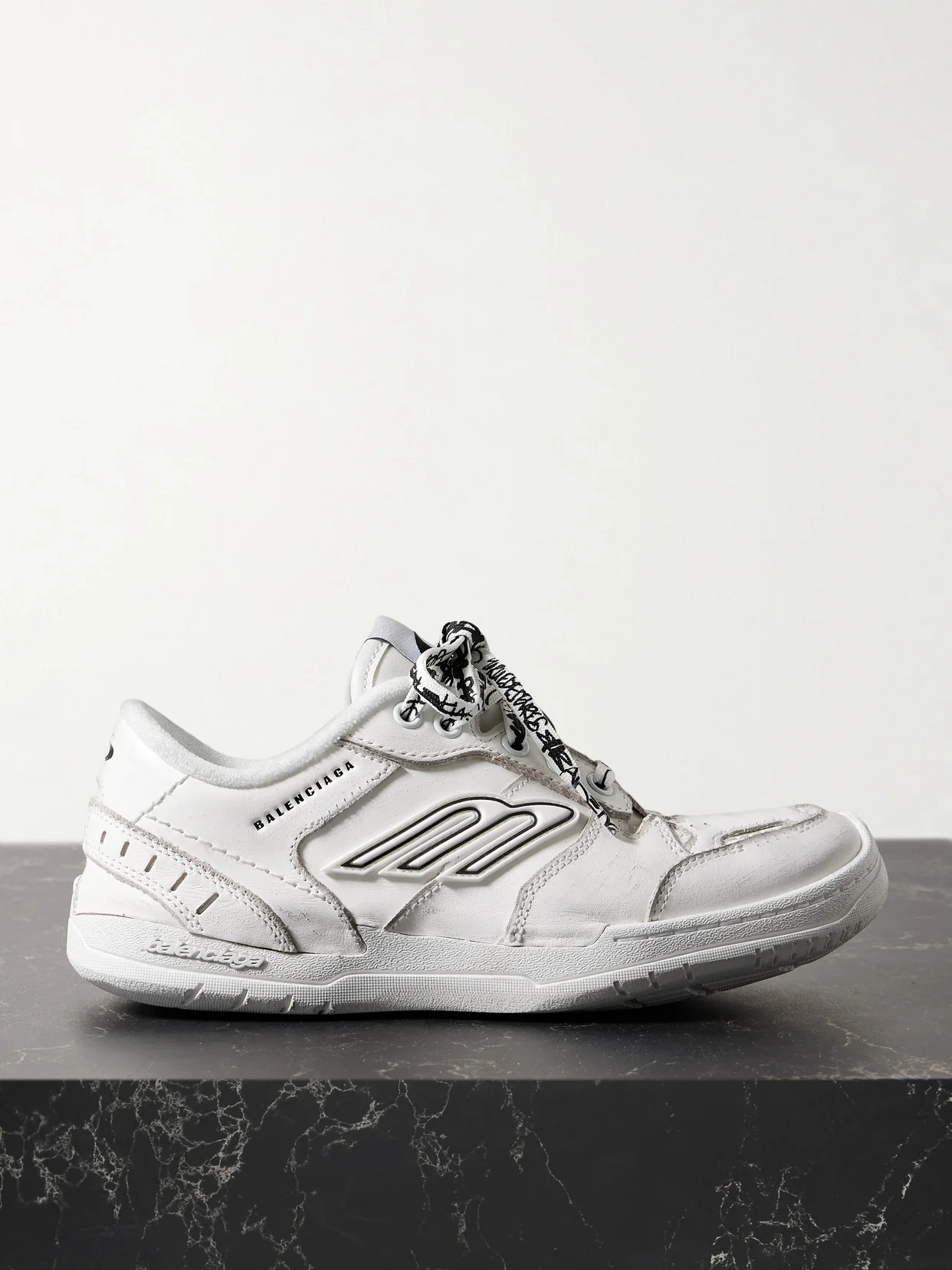 Balenciaga's chunky ‘Hamptons' sneakers resemble a pair that's been loved for years. Made from scuffed leather, they have rubberized logos and laces complete with ‘scribble' motifs.