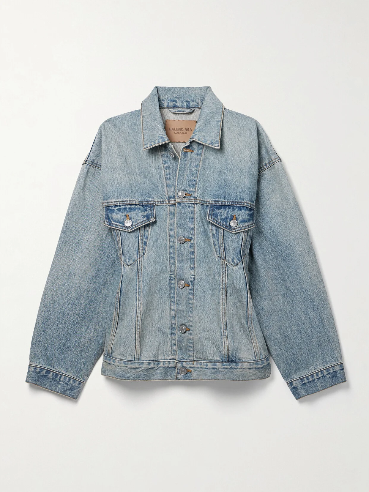 Balenciaga's jacket is constructed with contouring seams and a nipped-in waist to create the brand's signature 'Hourglass' silhouette. It's been made in Japan from light-blue denim that's faded for a lived-in look and is designed with dropped shoulders and voluminous sleeves.