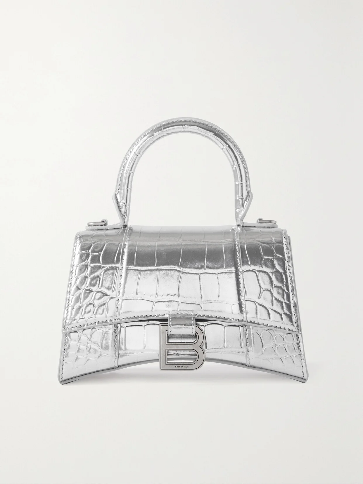 Balenciaga's 'Hourglass' tote harks back to the brand's statement tailoring. This 'XS' version has been made in Italy from metallic silver leather and features the 'B' logo on the front flap. It's just big enough to hold your cardholder and keys.