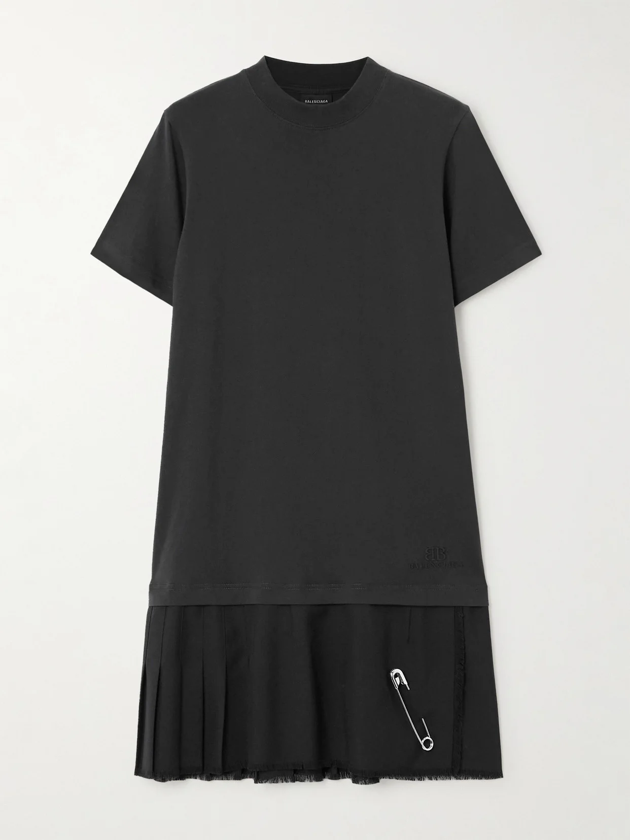 The layered construction of Balenciaga's mini dress gives the illusion of two styles worn together - a pleated wool-blend twill skirt and a cotton-jersey top. Artful distressing, frayed edges and punkish embellishments showcase the Maison's dedication to quality down to the details.