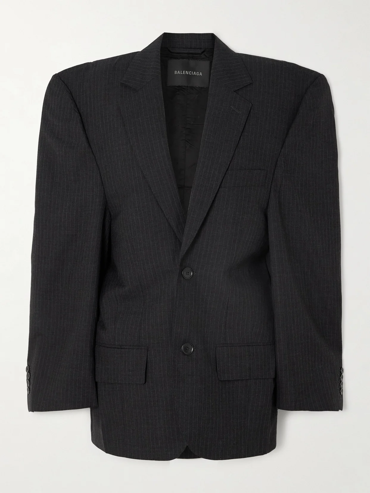 Loyal fans will instantly recognize the exaggerated proportions of this blazer as a Balenciaga signature. It has been tailored in Italy from pinstriped wool with notch lapels, square shoulders and elongated sleeves. Look closely and you'll see it has a subtly crinkled effect, which is totally intentional.