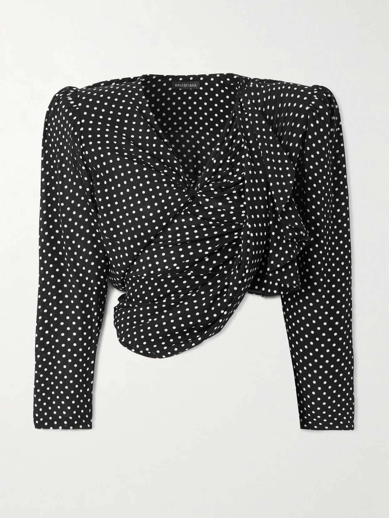 Balenciaga's Winter '25 collection reimagines classic dress codes in "inverted and twisted" ways. Made from polka-dot crepe de chine, this blouse has an asymmetric, deconstructed design with beautiful draping and puffed sleeves borrowed from vintage styles. Wear yours with the matching skirt from the collection.