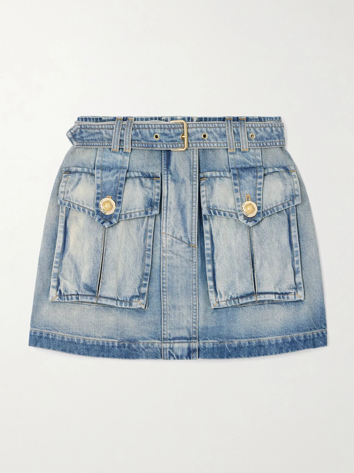 Balmain's utility-inspired mini skirt is made from denim that's faded to give it an authentically love-worn look. It's fitted with oversized cargo pockets featuring signature gold-tone 'Coin' buttons and comes with a belt to cinch and define your waist.