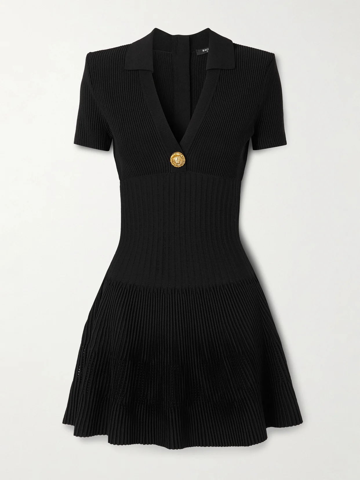 Balmain's dress is defined by the gold-tone 'Lion Head' button that draws the eye inward. Made from ribbed-knit, it has a deep V-neckline with a polo collar and fits close through the waist before flaring out to a mini skirt. The exposed back zip is another house signature.