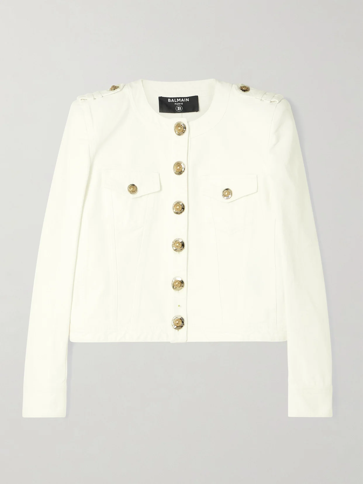 Balmain's jacket channels the house's signature military influences, evident in its structured shape, strong shoulders and traditional detailing. Made from cotton-canvas, it's decorated with gold-tone buttons at the pockets and epaulettes - a closer look reveals the crest engraving.