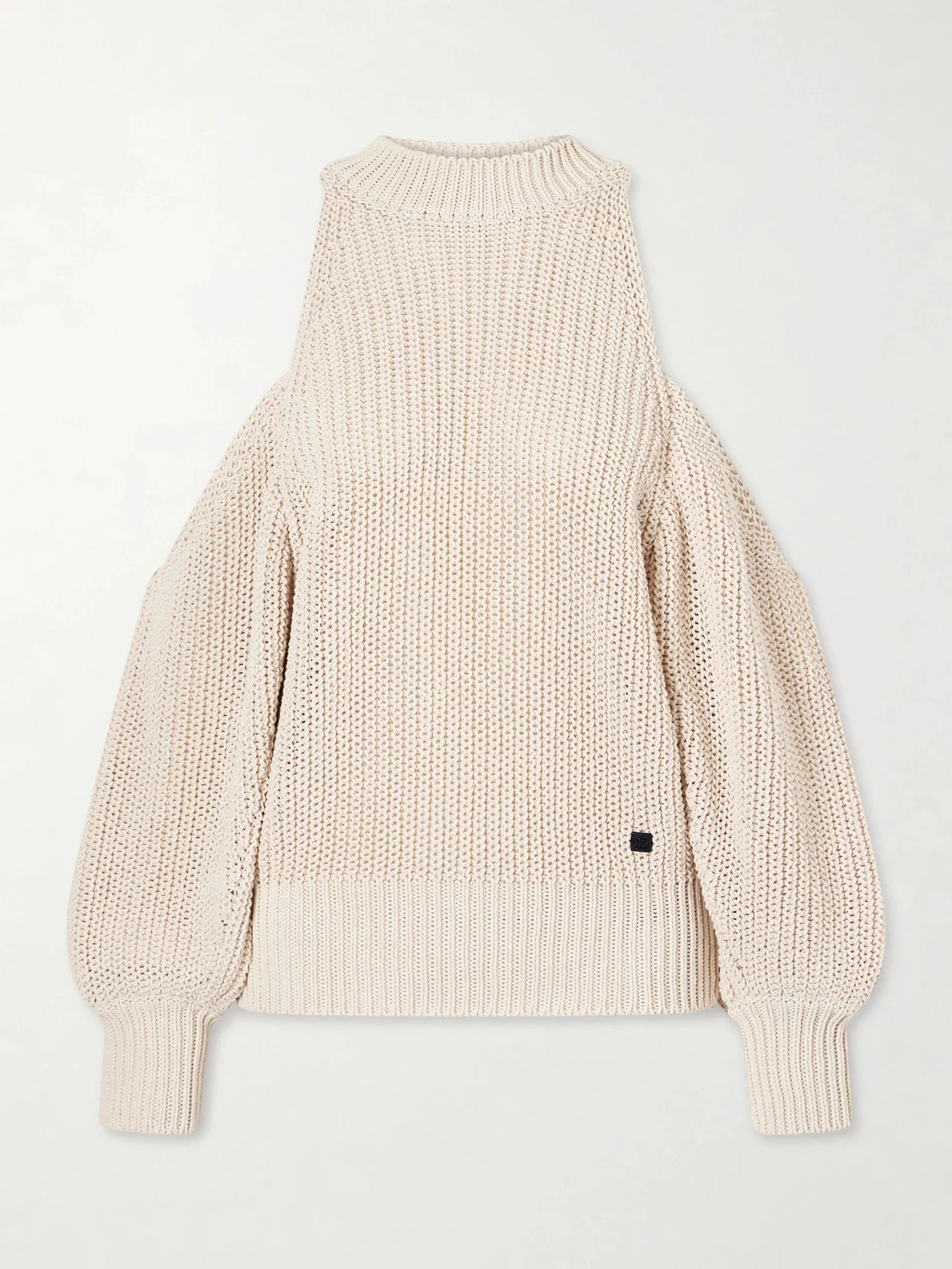 Knitted from soft cotton, Balmain's sweater stands out with its open-shoulder design. Wear yours with flared pants and sleek heels.
