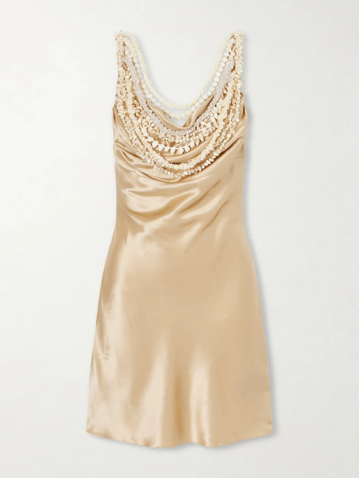 Balmain blends bold glamour with exquisite craftsmanship in this short silk-satin mini dress. The draped front neckline is accented with a cascade of beaded shells from front to back, creating texture, movement, and visual impact. Pair with minimal heels and understated accessories to let the detailing take center stage.