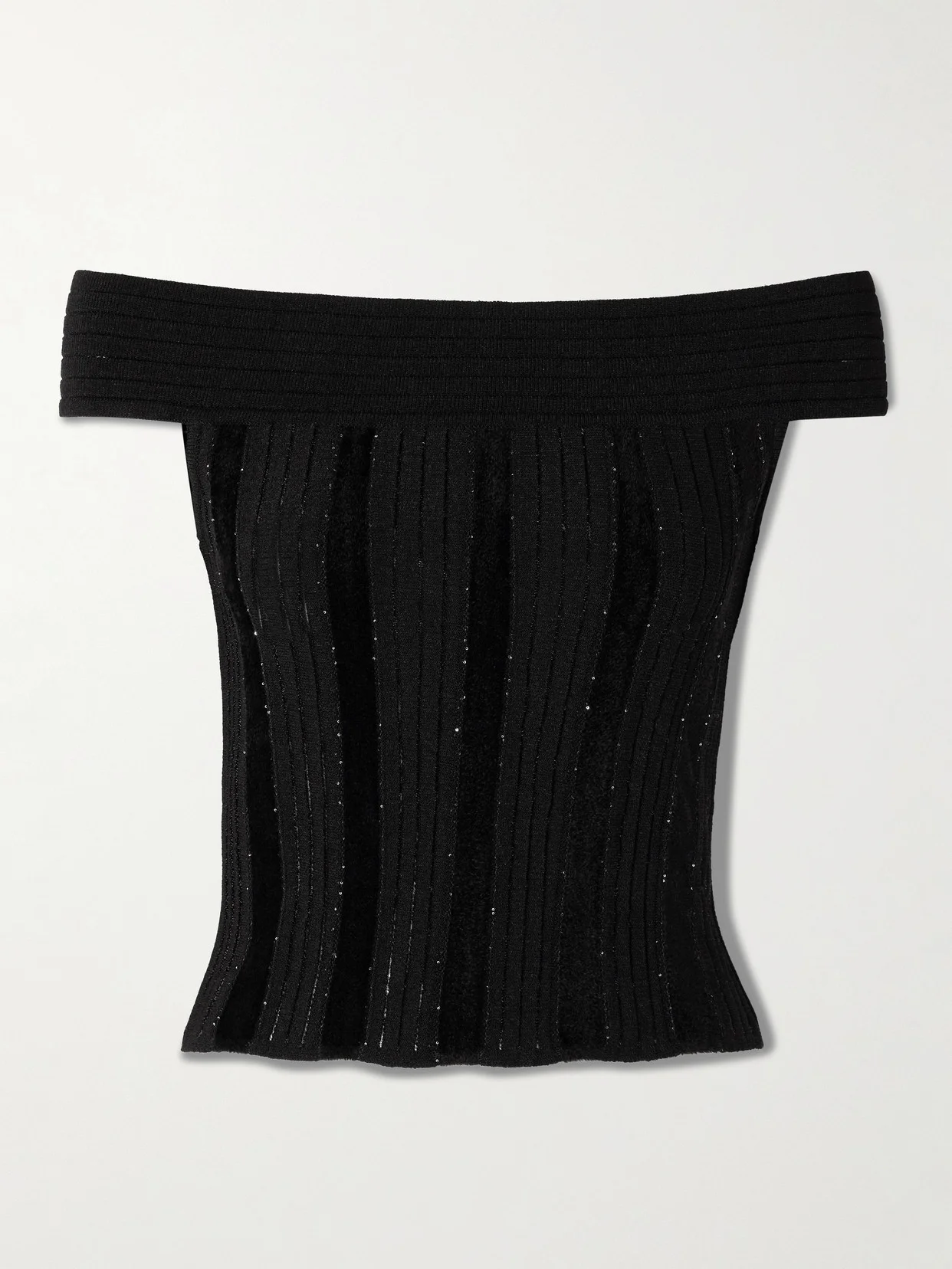 Off-the-shoulder Glittered Velvet And Ribbed-knit Top