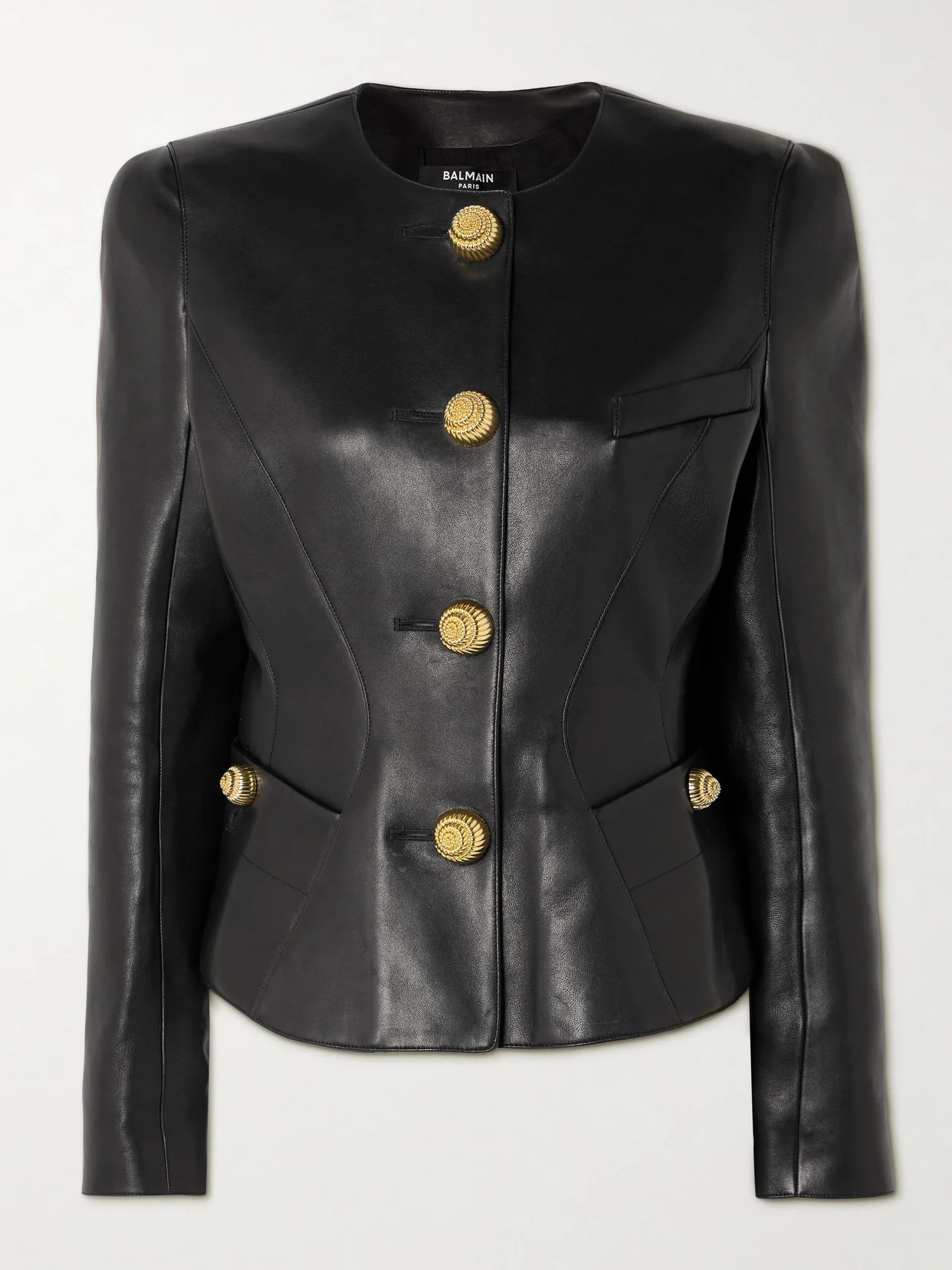 Balmain's jacket radiates '80s glamour - the snail-shaped buttons recall maximal costume jewelry from the era. Executed flawlessly, it's paneled from leather to nip in at the peplum waist, while the shoulders are structured for just the right shape.