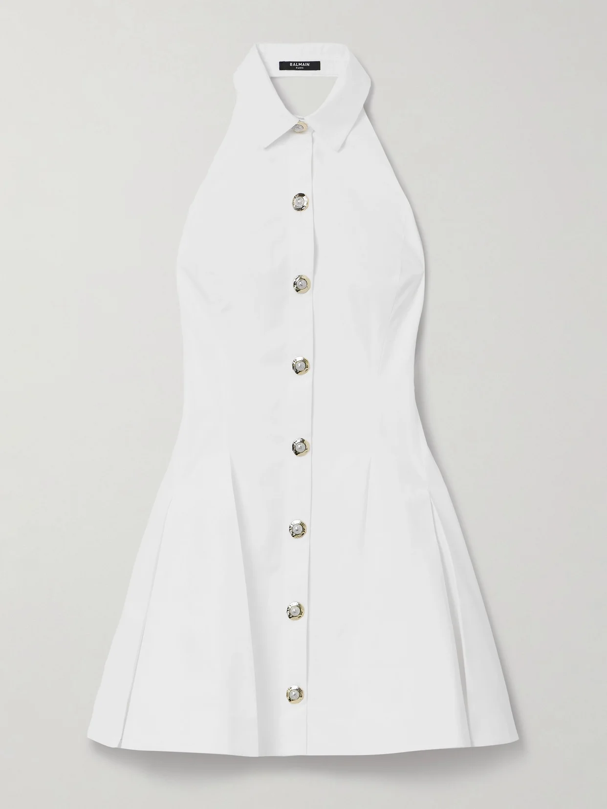 Balmain's halterneck dress is such a sophisticated choice for summer events. It's been made in Italy from crisp cotton-poplin decorated with hammered, mixed-metal buttons and has inverted pleats that enhance the shape and movement of the skirt.
