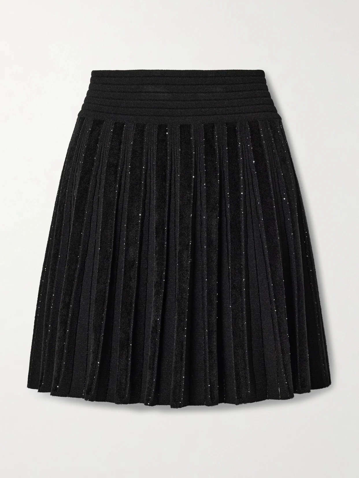 Pleated Sequin-embellished Velvet And Ribbed-knit Mini Skirt