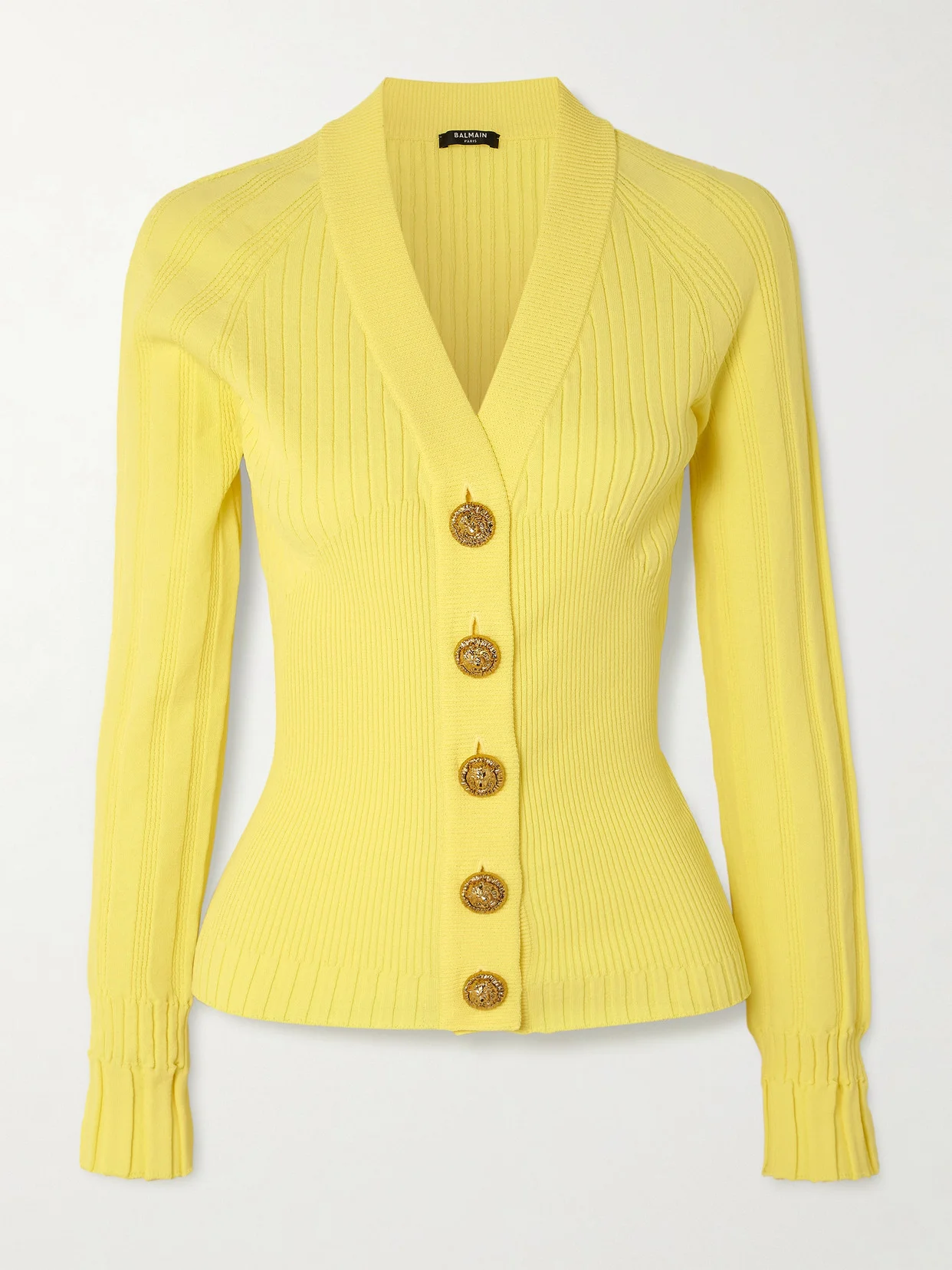 Offset with glamorous medallion buttons, Balmain's cardigan has been knitted in France - the yarn's fine gauge creates a light, smooth texture. There's no denying the butter-yellow hue's the color of the season.