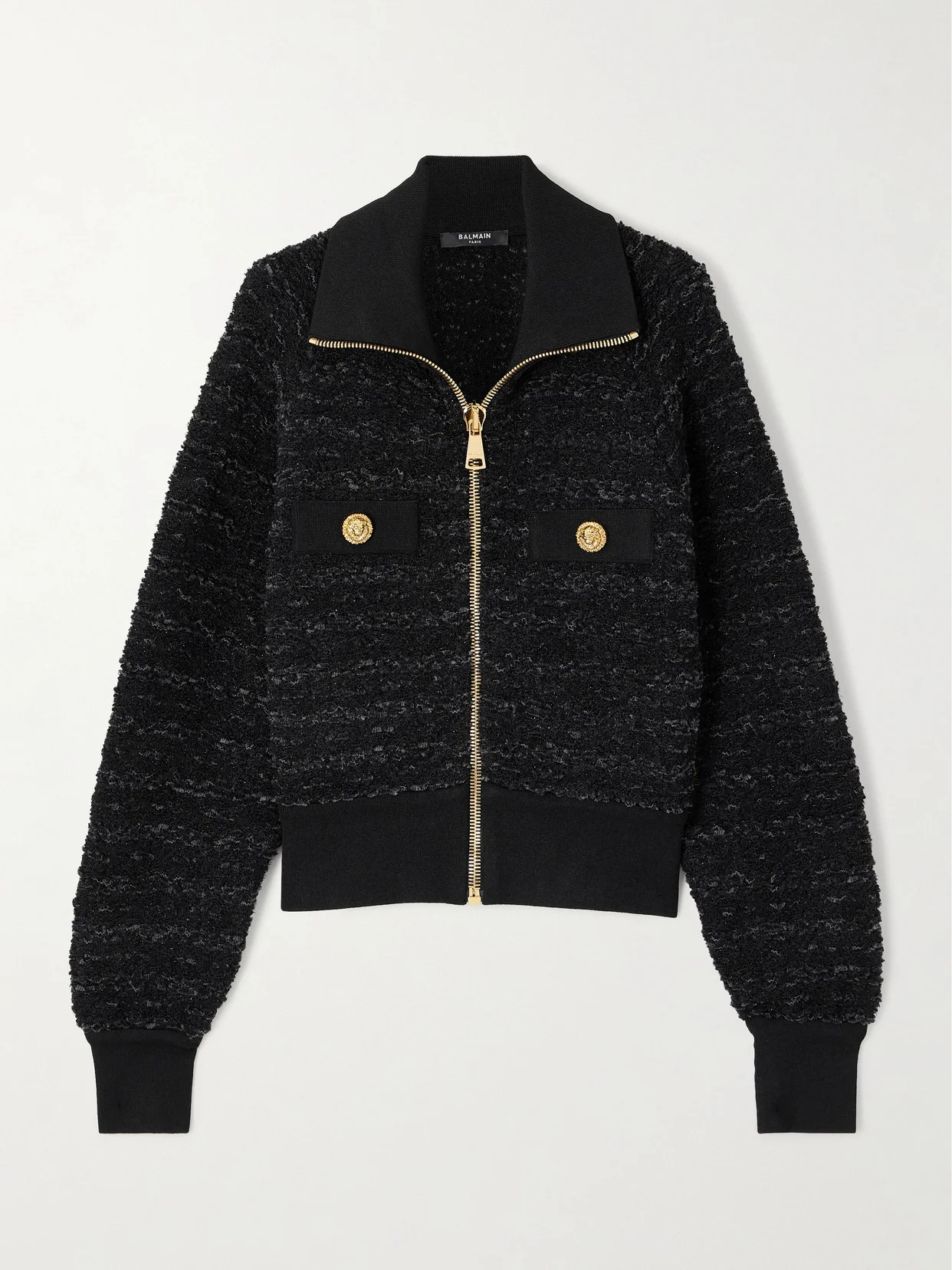 Balmain's jacket blends classic Parisian chic with a modern, utilitarian edge. It's been made in France from soft tweed with a cozy funnel neck and tonal ribbed trims outlining the bomber shape. Match your jewelry to the gleaming 'Lion Head' buttons.