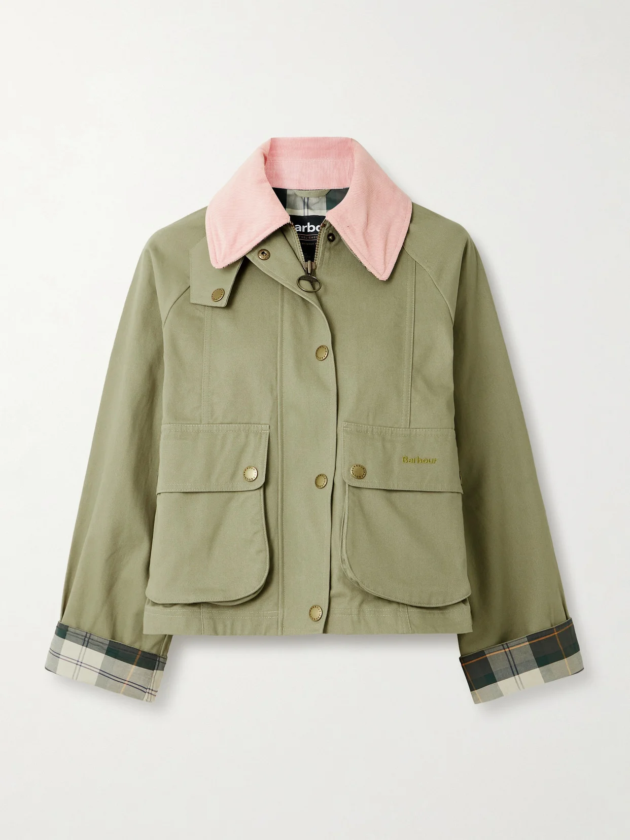 Barbour has 130 years of expertise in crafting iconic outerwear, so you know this 'Beadnell' jacket is designed to last. It's made from durable cotton-twill and has a large corduroy collar in a contrasting pink color. Turn up the cuffs to reveal the signature checked lining and stash your most-used cards and keys in the front pockets.