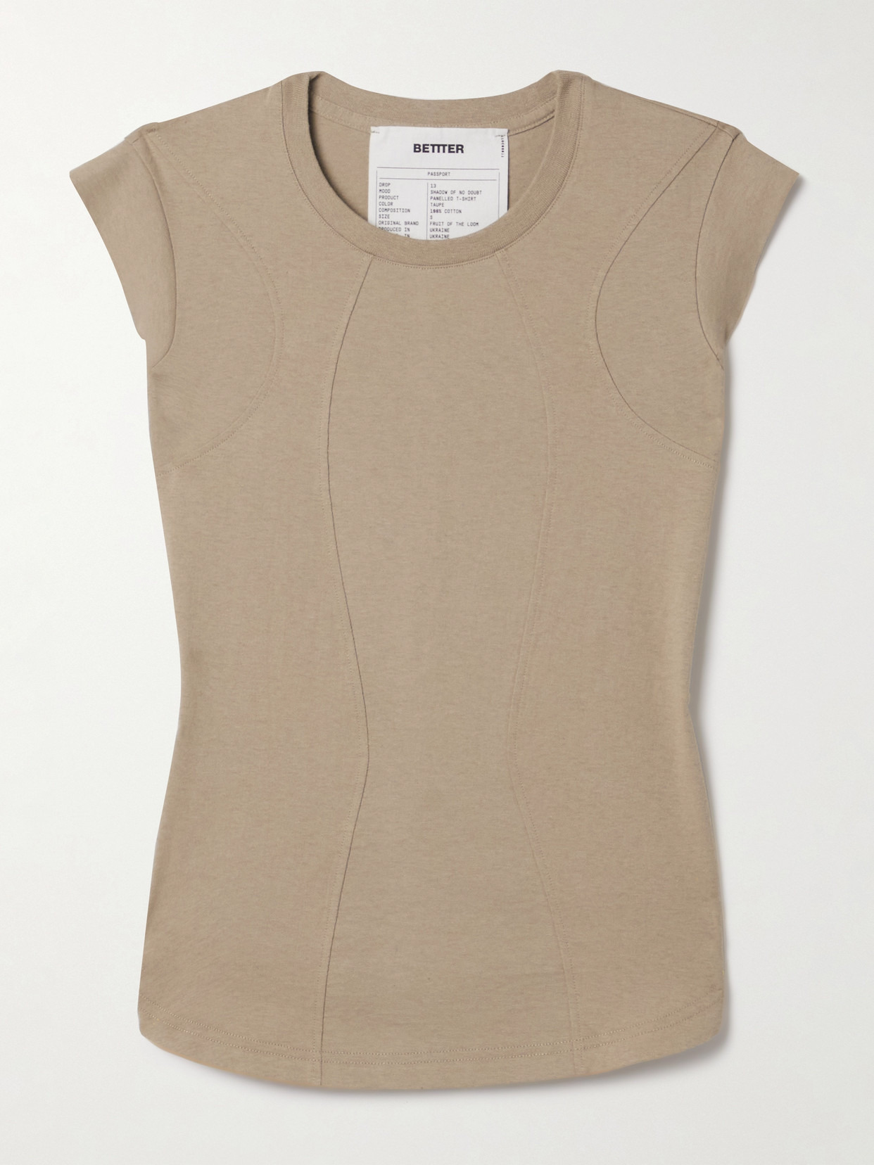 The curved paneling on BETTTER's T-shirt is a result of patching together deadstock fabric from old Fruit of the Loom designs. Made from taupe cotton-jersey, it's cut for a close fit and has cap sleeves. Team yours with one of the label's upcycled jeans or tailoring. This product was Designed for Circularity. Find out more about NET SUSTAIN here.
