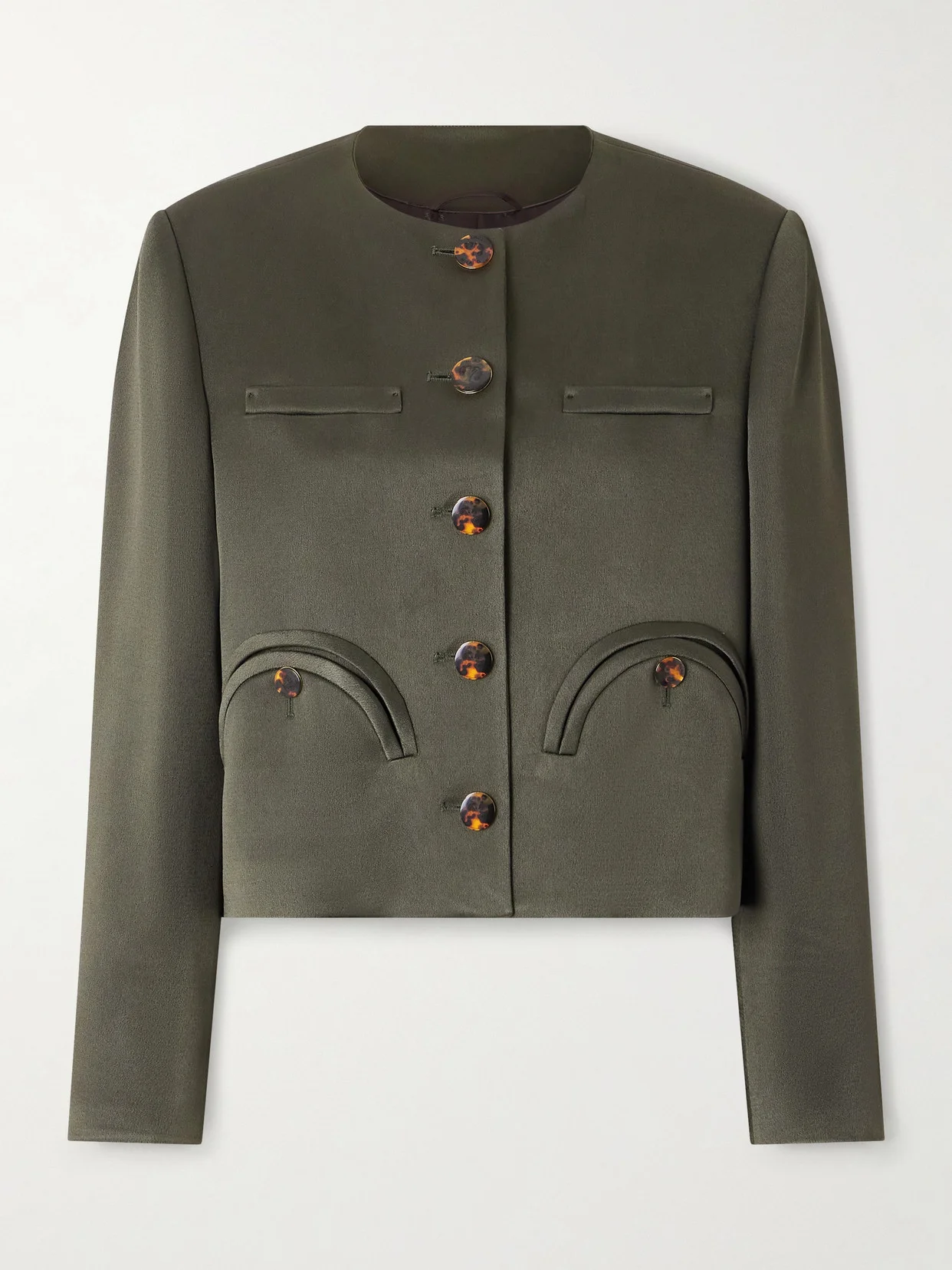 BLAZE Milano's 'Novalis Shamo' jacket is beautifully refined. Tailored in Italy from satin, it has a clean, collarless silhouette, the label's artfully curved welt pockets and contrasting tortoiseshell buttons.