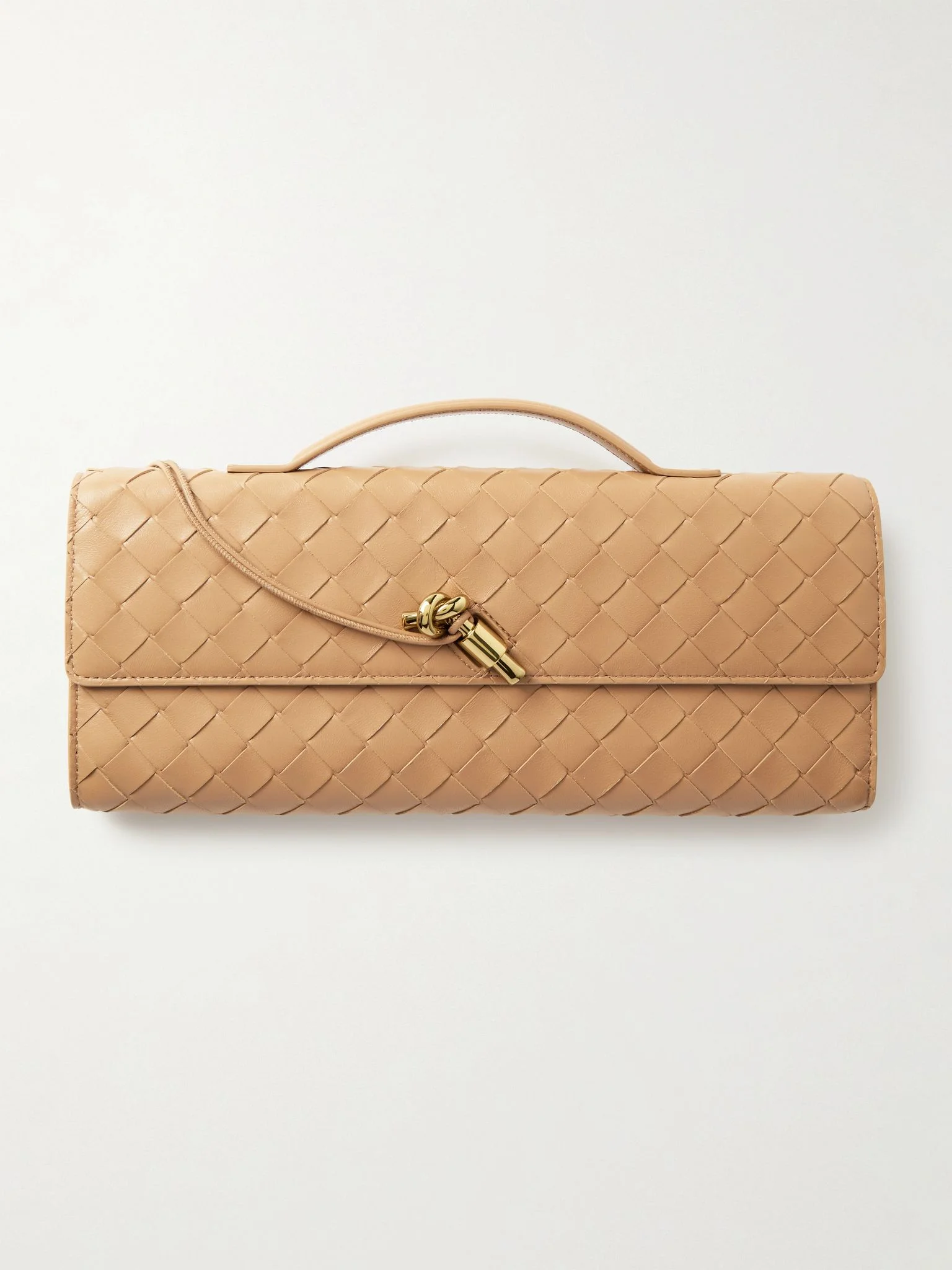 Bottega Veneta's 'Long Andiamo' clutch highlights the house's distinctive leather craftsmanship and attention to detail. It's woven using the brand's signature intrecciato technique and has a unique knot-shaped toggle fastening made from polished gold-tone metal. There's enough space inside for your phone, cardholder and lipstick – perfect for events when you don't have much to carry. Lower-Impact Materials. This product is made using at least 50% lower-impact materials or ingredients. Find out more about our NET SUSTAIN criteria here. Details & Care - Sand leather - Top handle - Internal slip pocket, six internal card slots - Toggle-fastening front flap - Comes with a dust bag - By purchasing this product, you are supporting responsible leather manufacturing through Leather Working Group.