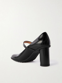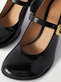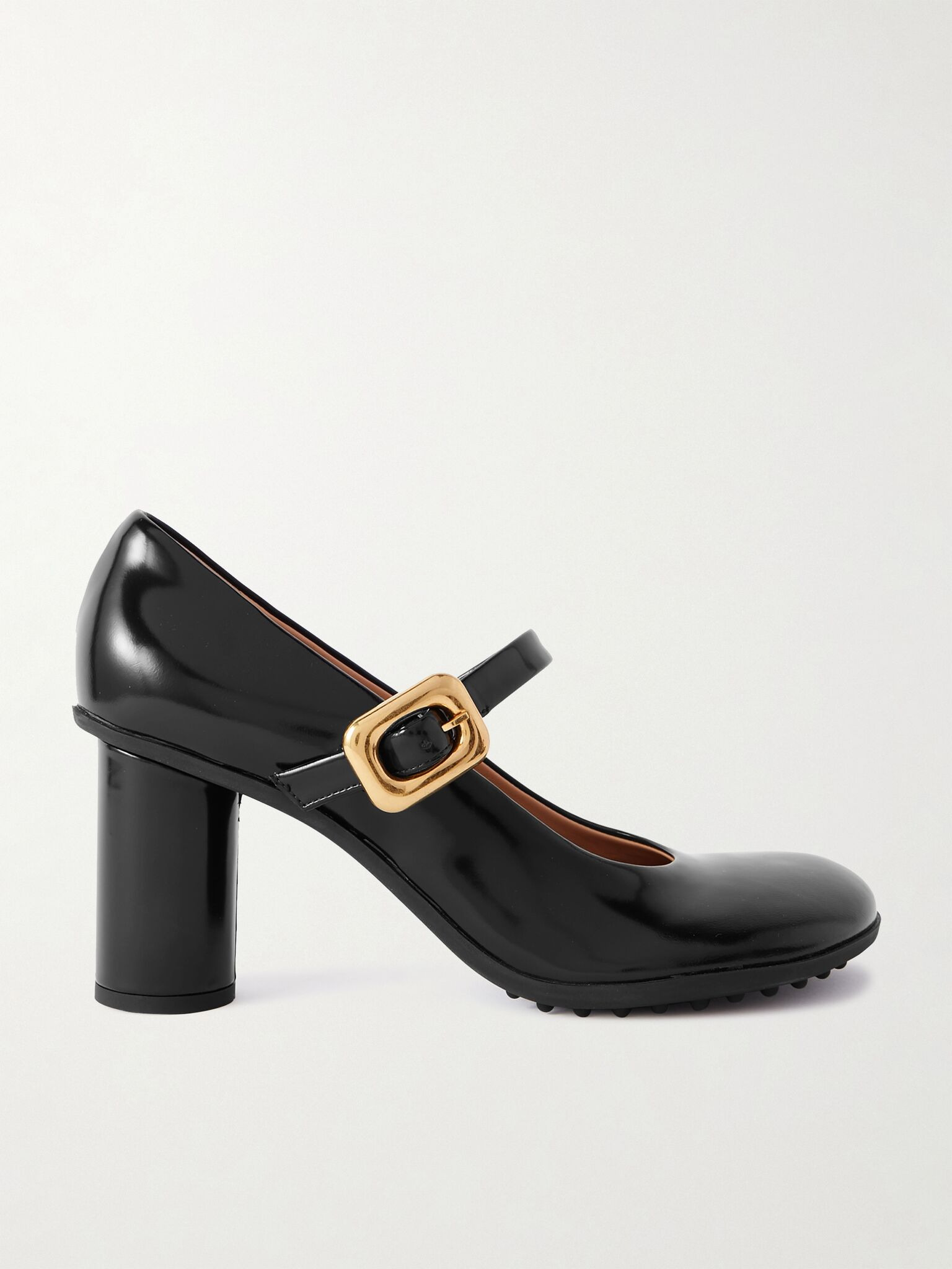 Bottega Veneta's 'Atomic' pumps are crafted from glossed-leather in a '60s-style Mary Jane shape with rounded toes and sculptural gold buckles. They rest on cylindrical heels and have gripped rubber soles. Details & Care - Heel measures approximately 90mm/ 3.5 inches - Black glossed-leather (Calf) - Buckle-fastening strap
