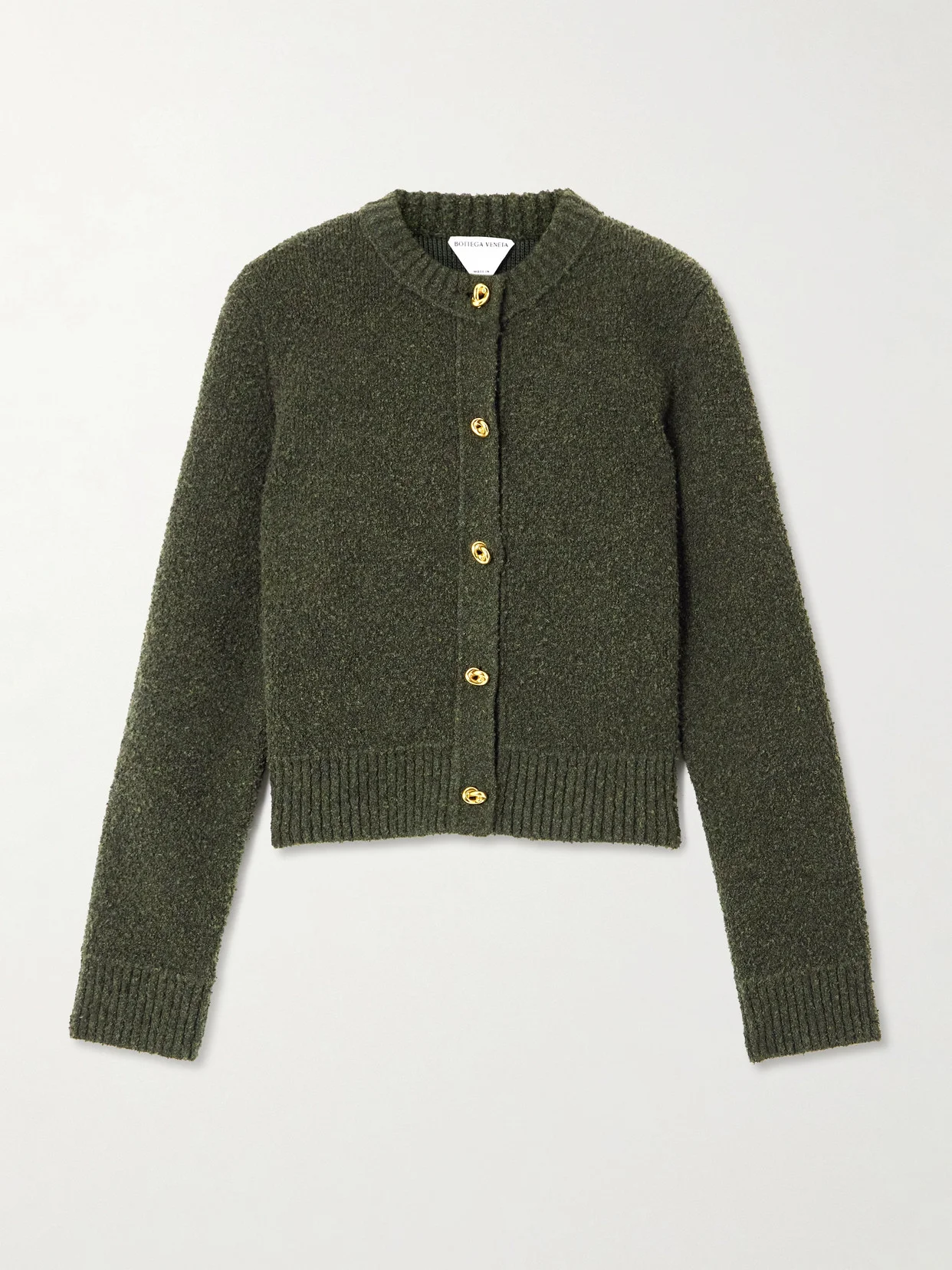 Cozy yet sophisticated, Bottega Veneta's cardigan is made from boucle in a melange of tonal-green threads. It's designed for a slightly loose fit defined by ribbed edges and has sculptural gold-tone buttons recalling the label's signature knotted hardware.