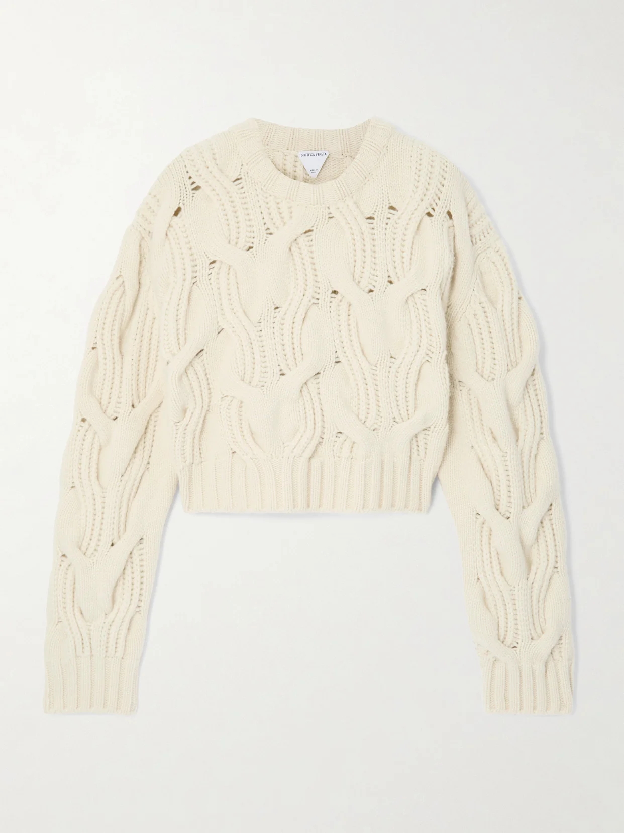 The chunky intertwining cables on Bottega Veneta's sweater makes it feel especially cozy. Made in Italy from certified wool, it has a relaxed shape with a slightly cropped hem. Wear it with your favorite jeans. Lower-Impact Materials. This product is made using at least 50% lower-impact materials or ingredients. Find out more about our NET SUSTAIN criteria here.