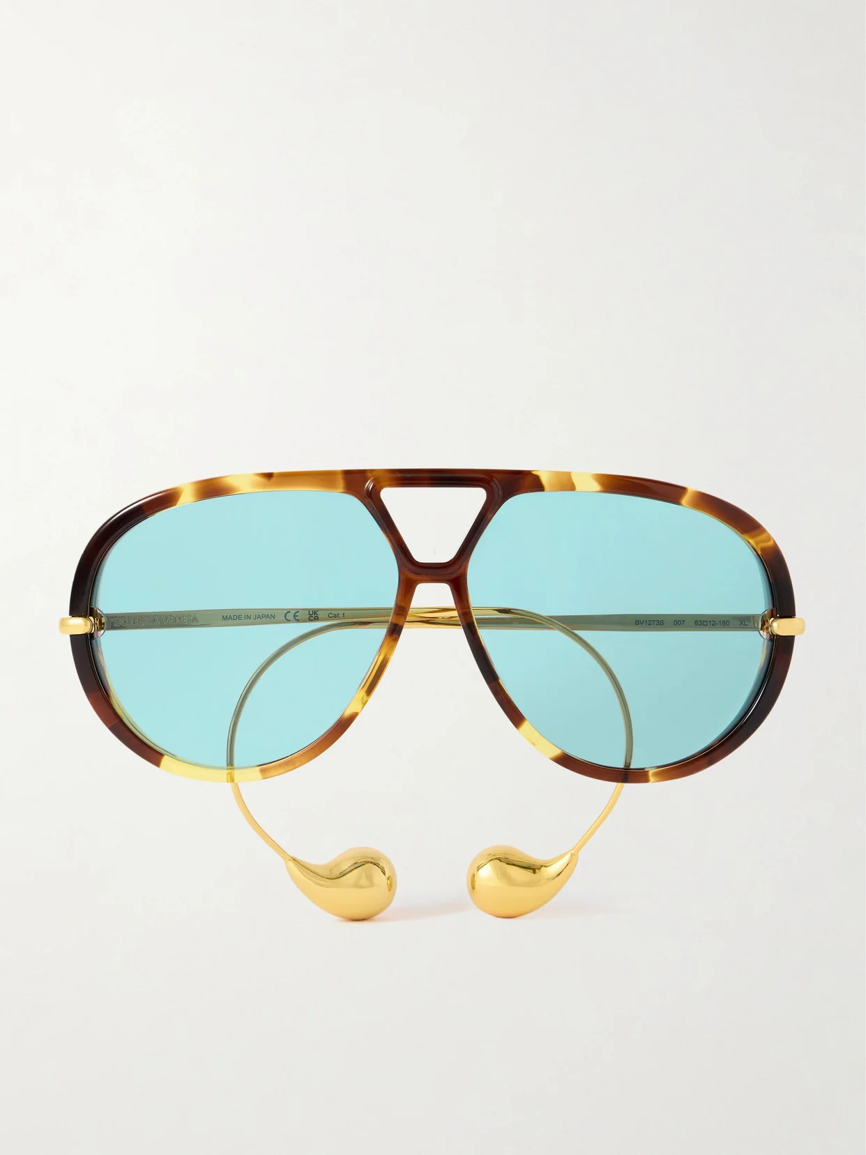 Bottega Veneta Eyewear's innovative sunglasses have curved gold-tone arms tipped with embellishments that are meant to resemble the label's dome-shaped earrings. They're made from tortoiseshell recycled-acetate and have classic aviator-style frames.