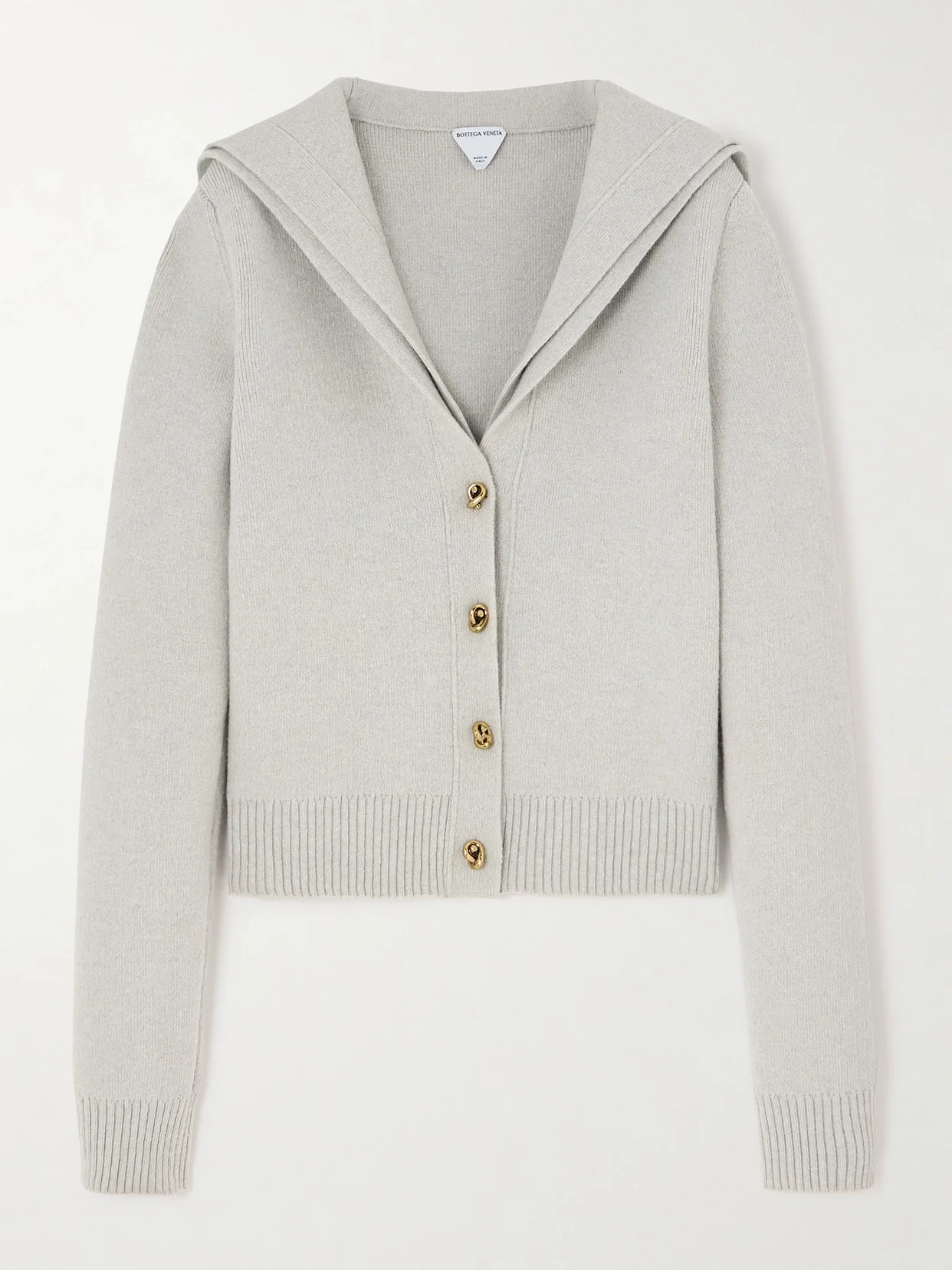 Bottega Veneta's chunky cardigan is densely knitted from wool so it feels a bit more structured than most. It's designed with a layered collar inspired by sailor styles and fastens with gold-tone knotted buttons - a new brand signature.