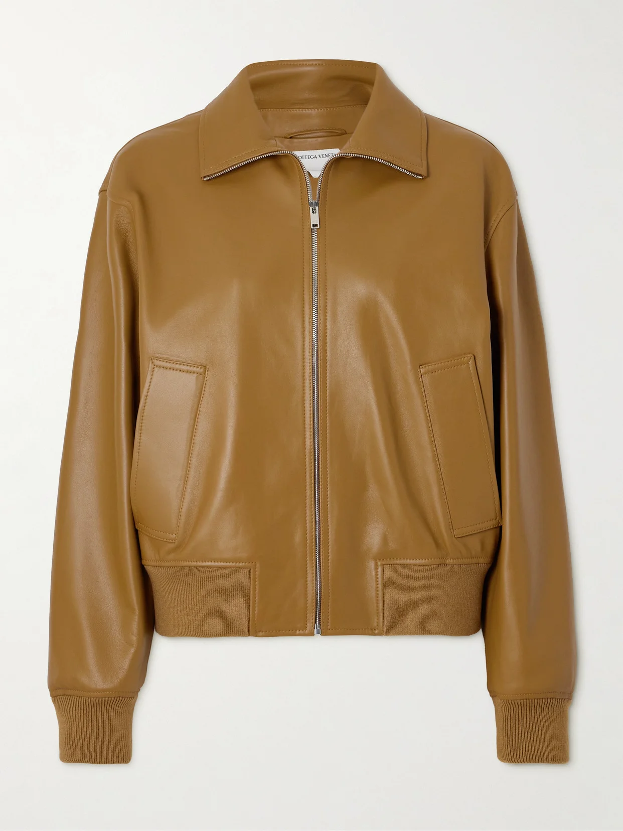 Bottega Veneta's history of leather craftsmanship is flawlessly showcased with this jacket. It's made from smooth panels in a bomber shape, tempered by rib-knitted trims in a tonal caramel color. Style yours with jeans or experiment with other earthy shades.