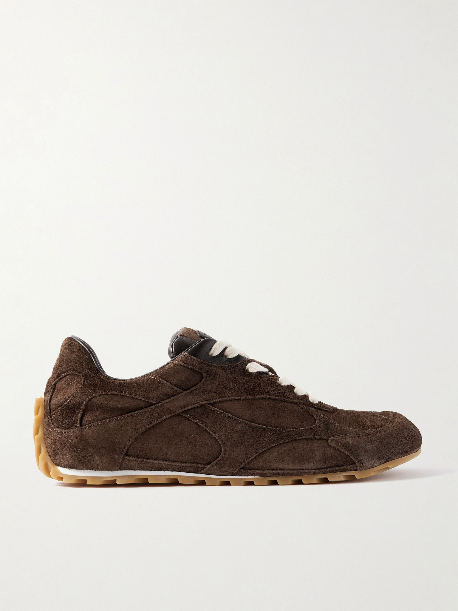 Bottega Veneta’s 'Orbit' sneakers are continuously reimagined, yet the signature elements – sleek lines, sculptural soles and refined craftsmanship – remain unmistakably intact. This 'Flash' version is made from panels of suede and has tonal leather trims and contrasting laces. The gripped rubber soles ensure traction. Size & Fit - Fits true to size, take your normal size - Only available in full sizes, go up to the nearest whole size if you take a half size - European sizing Details & Care - Rubber sole measures approximately 20mm/ 1 inch - Dark-brown suede and leather (Cow) - Lace-up front