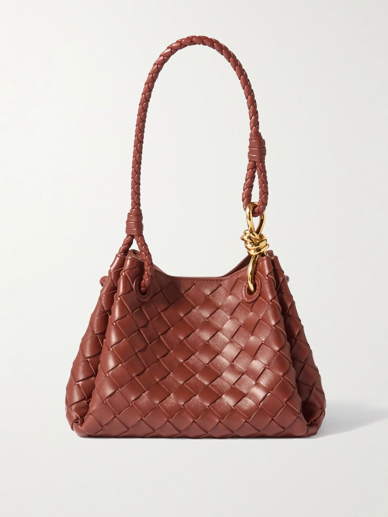 Bottega Veneta's 'Parachute' shoulder bag is intrecciato woven from leather - a symbol of the label's artistry, and which feels beautifully soft and pliable. In a small size that expands slightly by virtue of the side folds, it'll fit your phone, cardholder and earbuds. Details & Care - Brown leather (Lamb) - Top handles, detachable adjustable shoulder strap - Unlined - Magnetic-fastening tab at open top - Comes with a dust bag