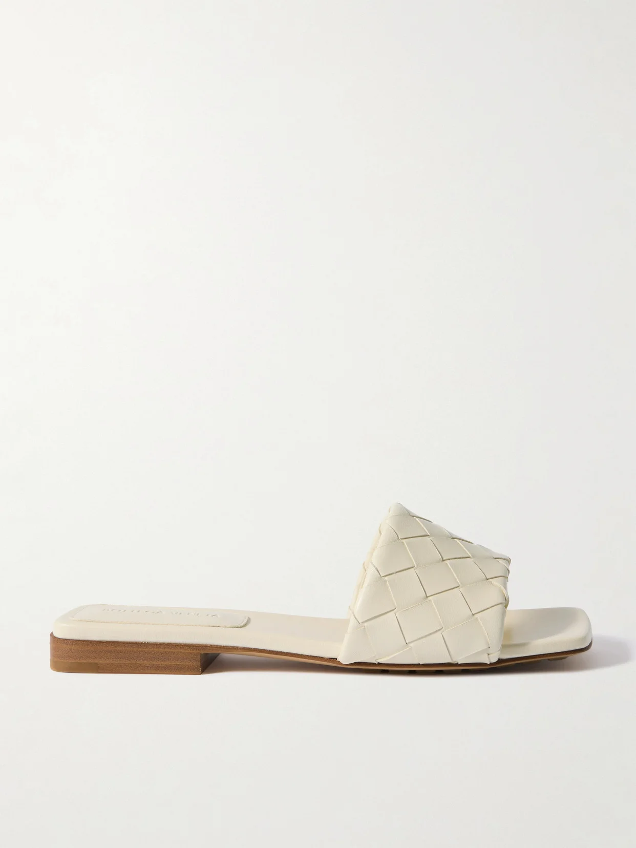 Bottega Veneta's signature intrecciato weave is as recognizable as any logo. These 'Riva' slides are meticulously made from supple strips of leather using the technique and have squared toes and slight heels. Lower-Impact Materials. This product is made using at least 50% lower-impact materials or ingredients. Find out more about our NET SUSTAIN criteria here.