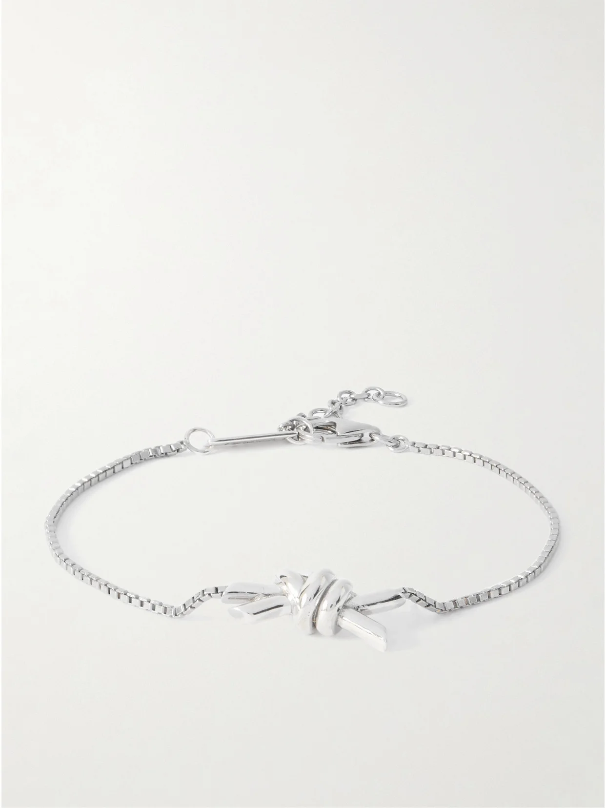 Bottega Veneta's bracelet is strung with the label's signature 'Knot' - an archival motif that symbolizes the past, present and future. It's been made in Italy from silver and has a geometric box chain strung with a rectangular, logo-engraved plaque. Use the lobster clasp to adjust the length.