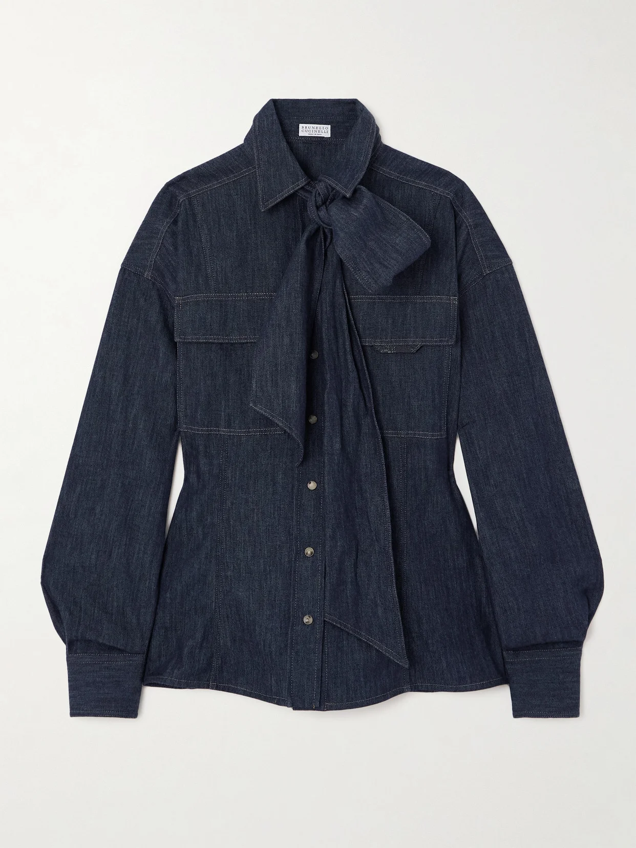 A feminine twist on classic Americana, Brunello Cucinelli's shirt is designed with pussy-bow ties that sit neatly beneath the collar. It's made from dark-wash denim that nips in at the waist and has contrasting threads tracing the dropped shoulders and flap pockets. Don't miss the signature Monili beaded detail.