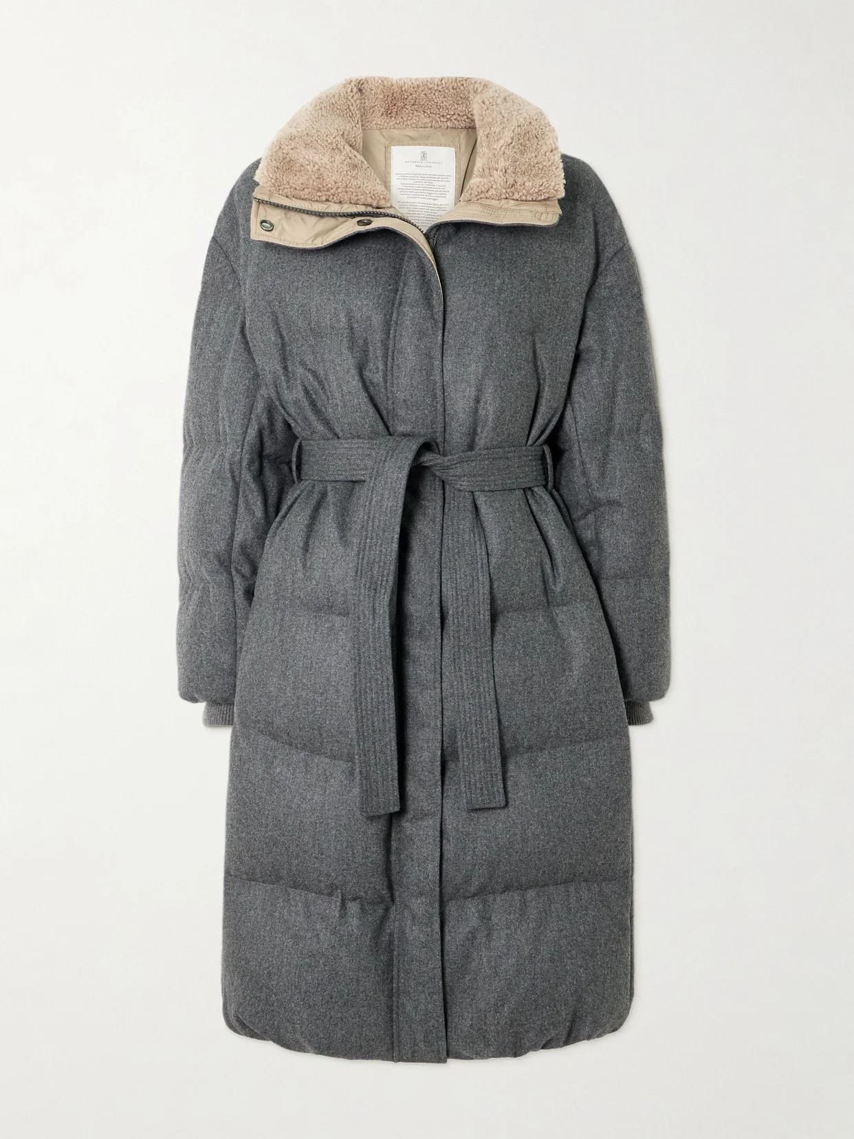 Brunello Cucinelli's quilted coat is padded with insulating down and lined with soft shearling at the collar for ample warmth. It's made from soft wool and comes with a belt so you can cinch the waist.