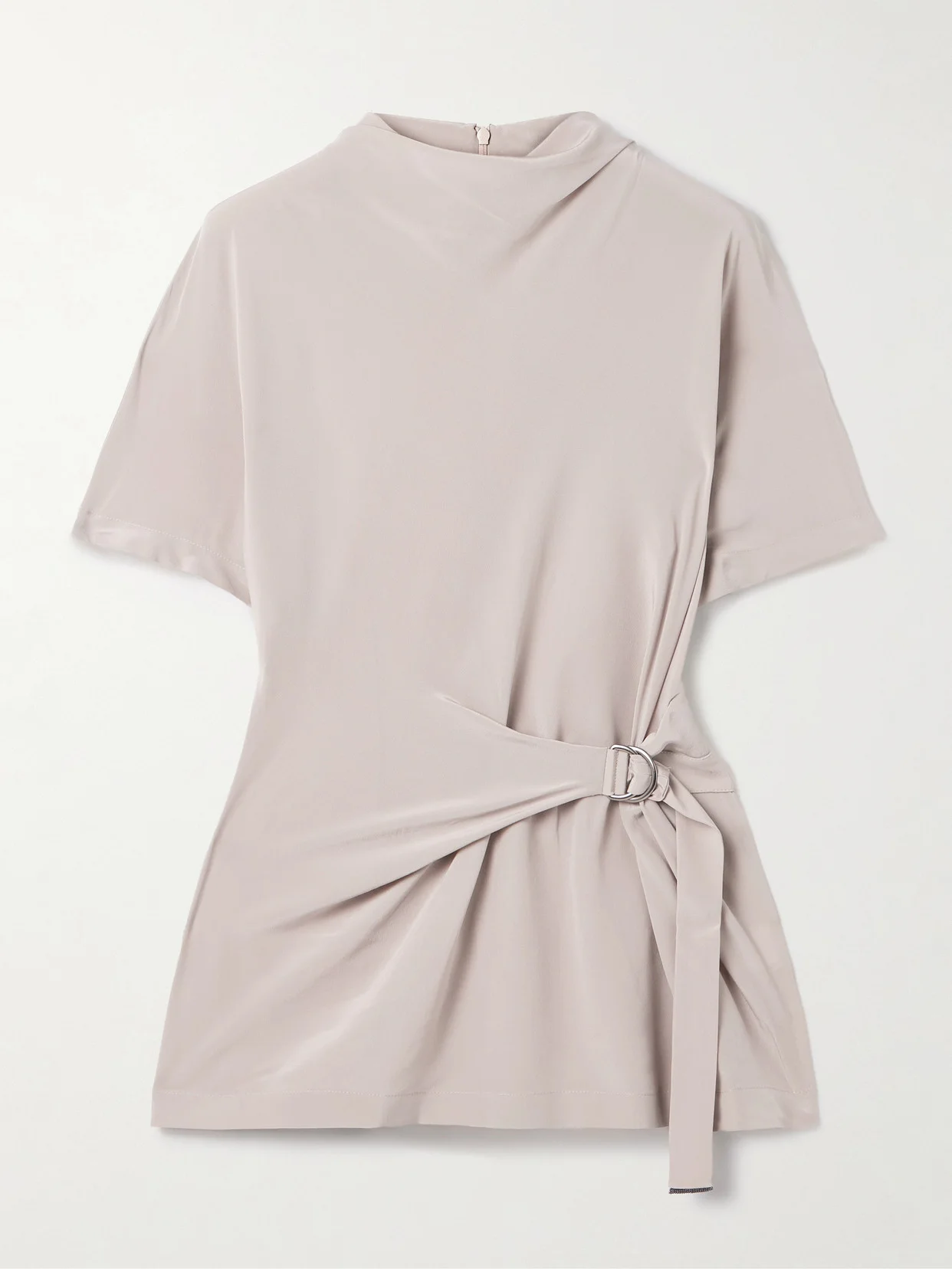 From the draped cowl neckline to the cinching D-ring detail, Brunello Cucinelli's top blends relaxed elegance with a touch of utilitarian edge. It's cut from fluid silk crepe de chine and features subtle Monili beads along the tab. Wear it with minimal, dainty jewelry.
