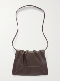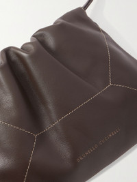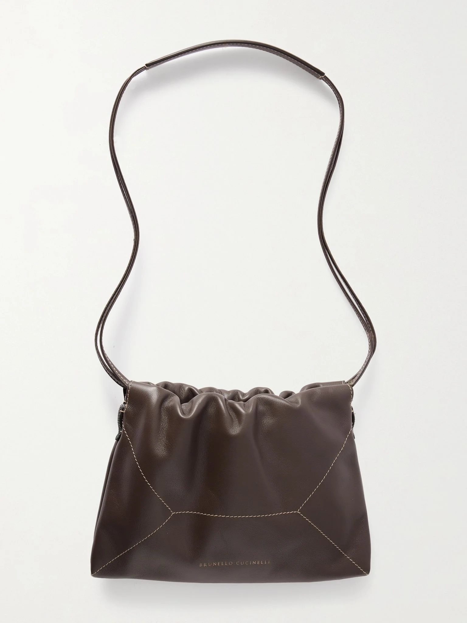 Brunello Cucinelli's bag has been made in Italy from soft leather that enhances the slouchy shape. It's stamped with a subtle logo and threaded with drawstrings that double up as shoulder straps. The sides are subtly embellished with signature Monili beads. Details & Care - Material: calf leather - Lining: suede - Internal details: card slot - Closure: drawstring top - Shoulder strap - Made in Italy - Colour: brown
