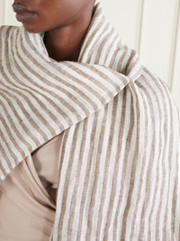 Brunello Cucinelli's scarf captures the house's understated elegance. Made in Italy from linen-blend woven with metallic fibres, it's patterned with neutral stripes and finished with delicate frayed edges. Drape yours over tailoring or a simple knit to add texture and a gentle shimmer.