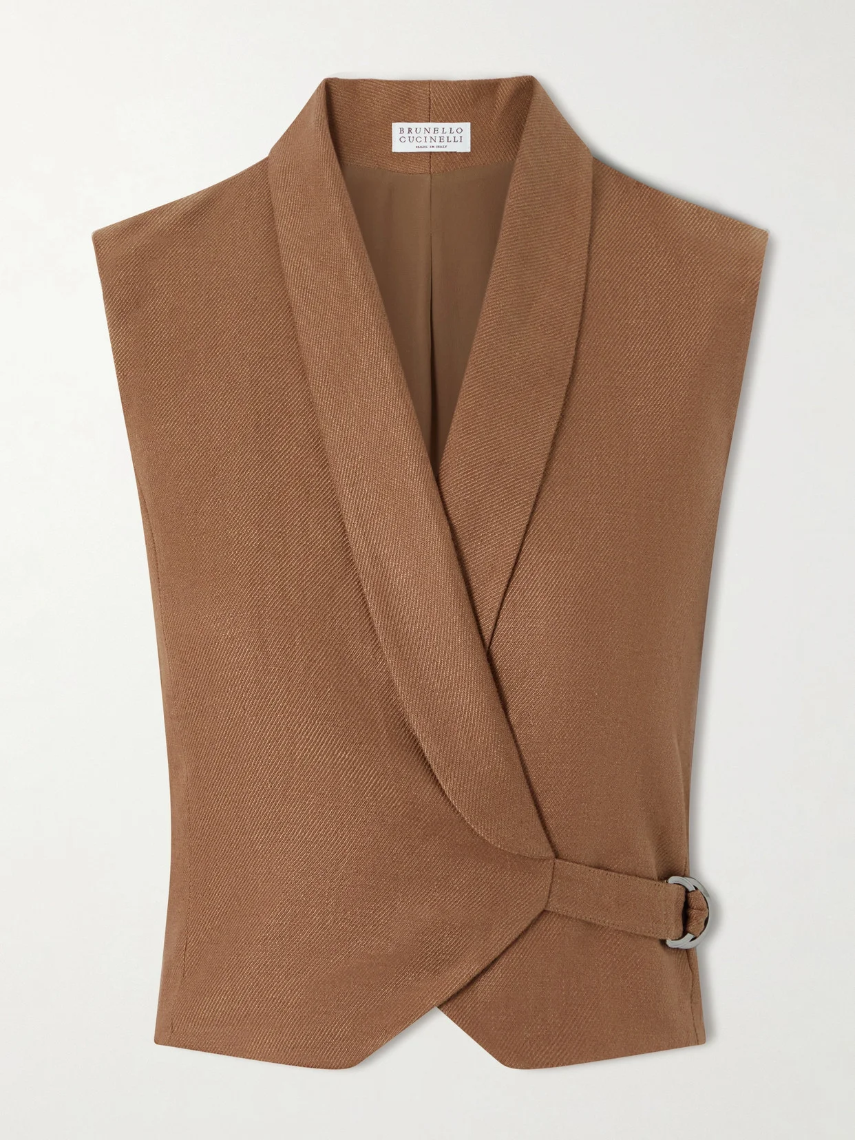Brunello Cucinelli's vest is tailored for a relaxed feel. Made from linen-twill, it has a wrap profile held by an adjustable D-ring belt. The shawl lapels are outlined with dainty Monili beads - sweep long hair up to show this signature vest off.