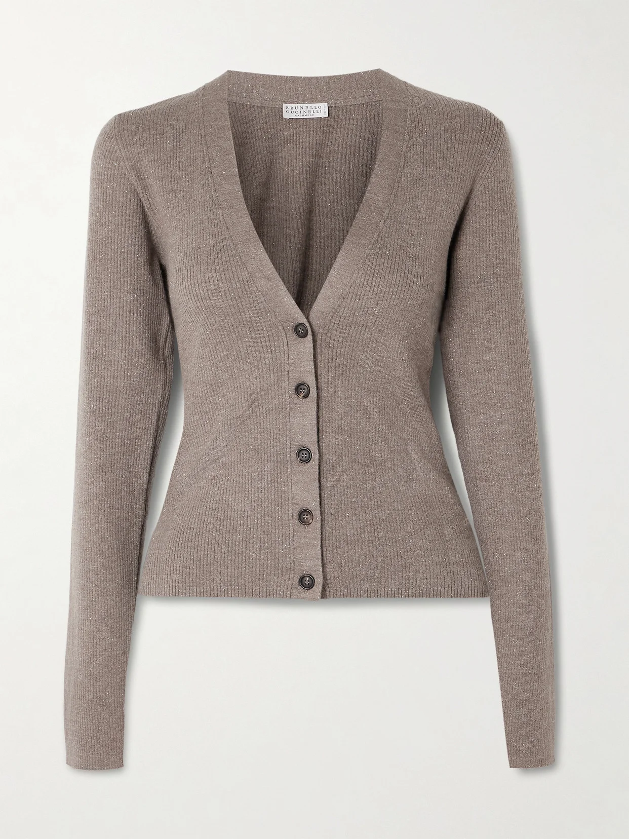 Brunello Cucinelli's cardigan is spun with metallic thread for a subtle sparkle. It's rib-knitted with touches of cashmere and has a deep V-neckline, so it's ideal for layering or showing off a statement pendant.