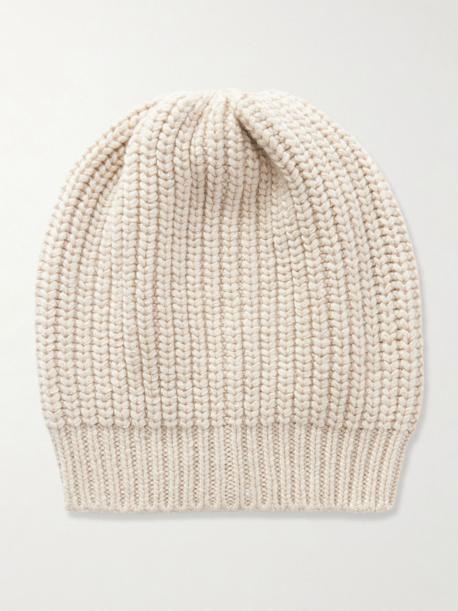Sequin-embellished ribbed cashmere and silk-blend beanie Beige