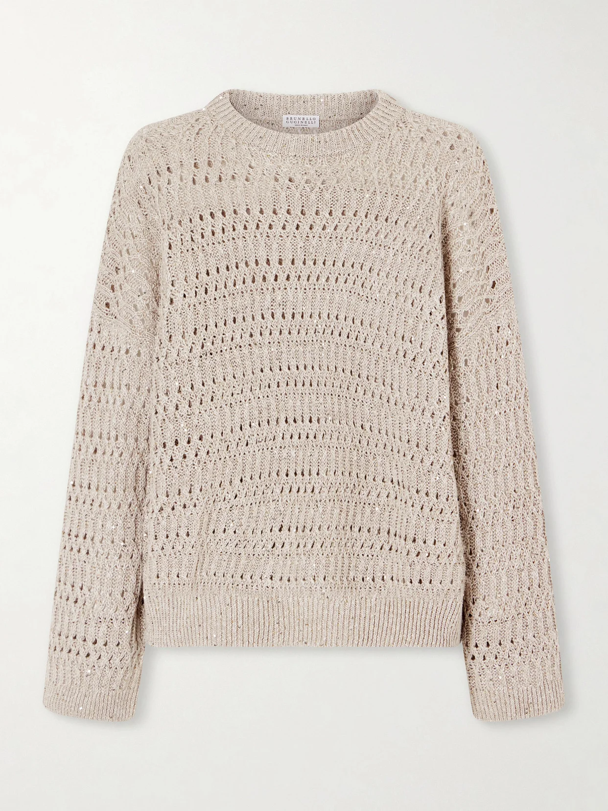 There's something special about the way Brunello Cucinelli's sweater glistens. Far from a basic layer, it's knitted with an open weave from linen-blend and threaded with dainty but dazzling sequins.