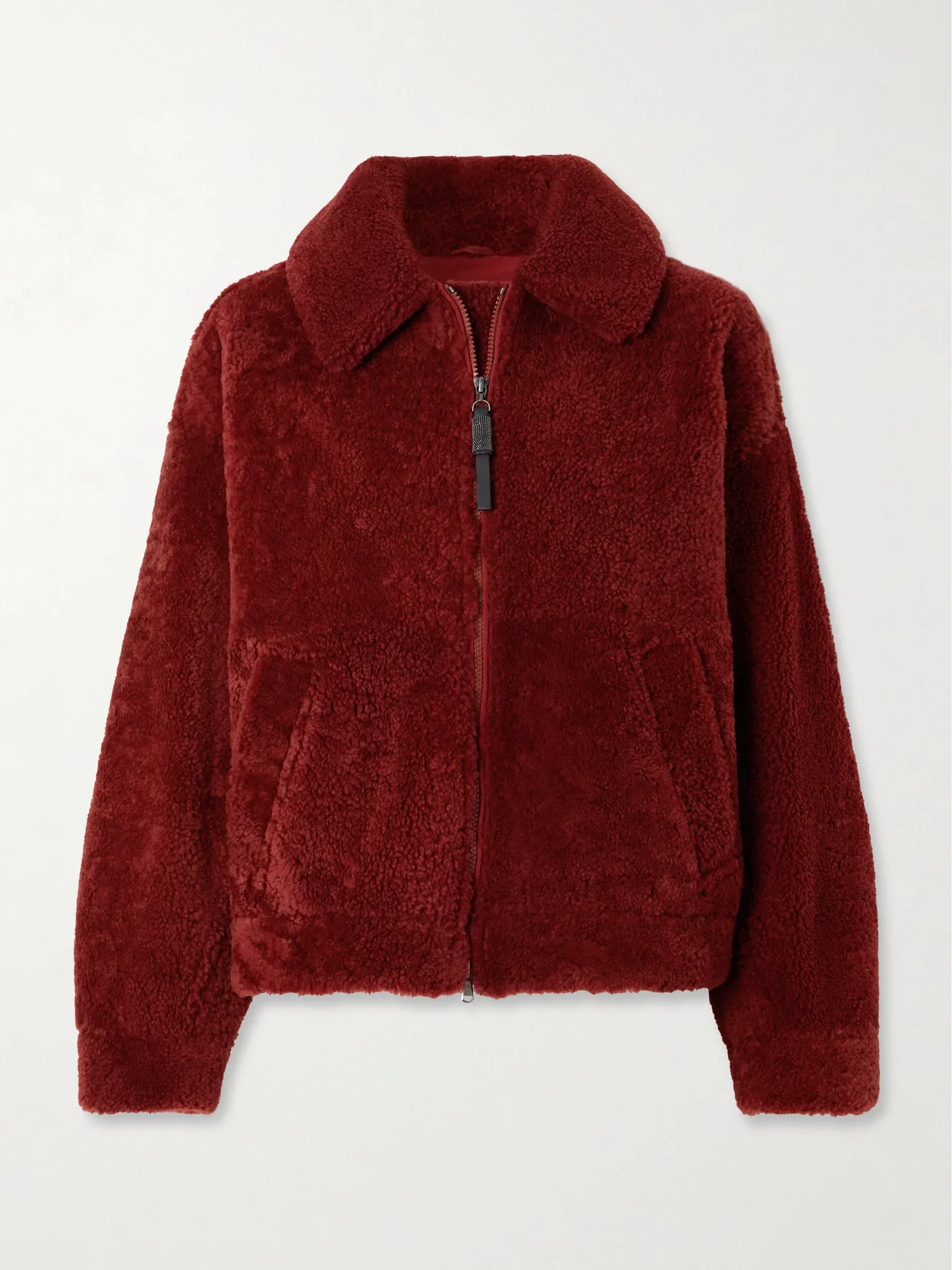 Brunello Cucinelli is renowned for using sumptuous, quality fabrics, which elevate each design and ensure they really last. This jacket is made from plush shearling in a rich red shade and has an aviator-inspired shape complete with a neat collar and partially elasticated hem.