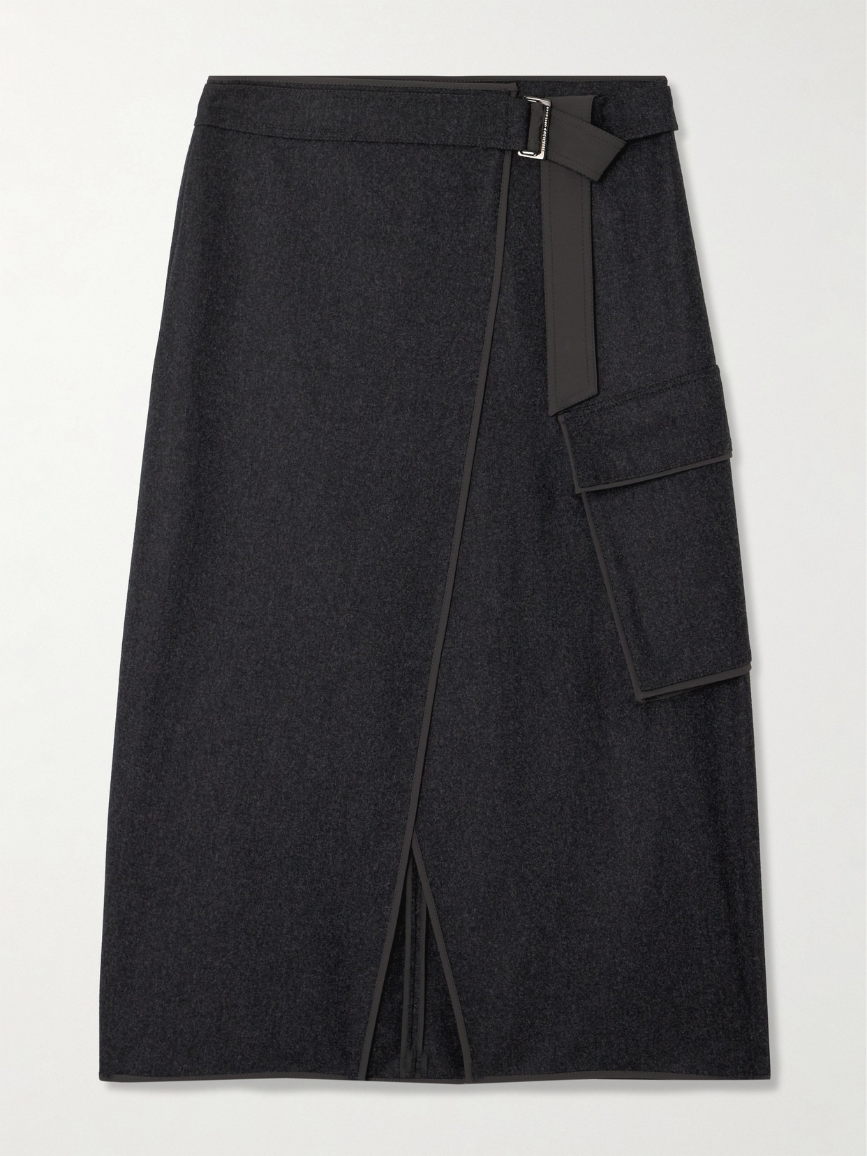 Brunello Cucinelli's midi skirt is made from wool-felt and has smooth shell trims that outlines the wrap silhouette. The generous cargo pocket adds a utilitarian feel, while the front split shows off a flash of leg.