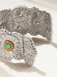 Buccellati often looks to famed Italian sculptors, painters and architects for inspiration. Handcrafted in Italy, this sterling silver bracelet is artfully cast into the shape of blooming daisies, each topped with diamonds and blue agate in gold-plated settings.