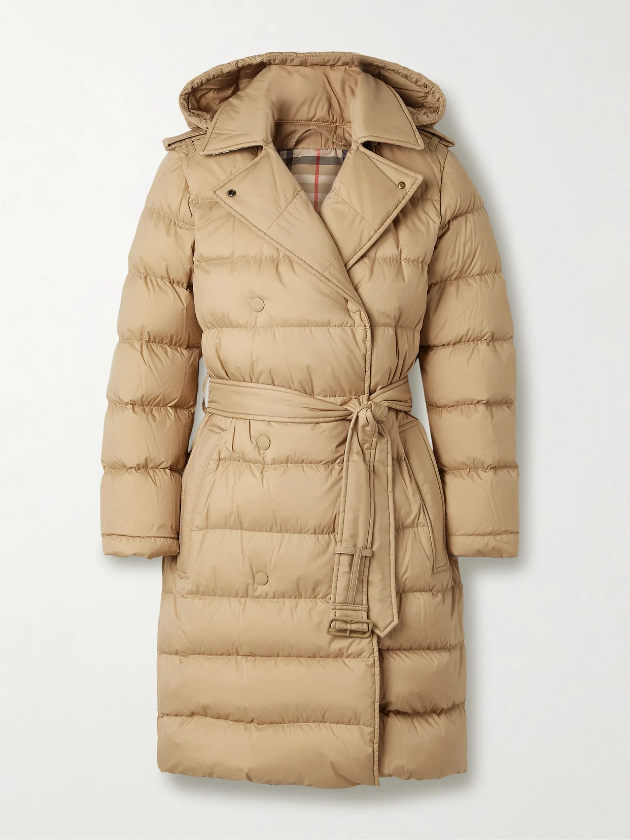 Burberry elevates classic puffer coats with this double-breasted design. Made from quilted shell, it's filled with down for warmth and has a coordinating belt to define the shape. Pop the collar to show off the checked underside.