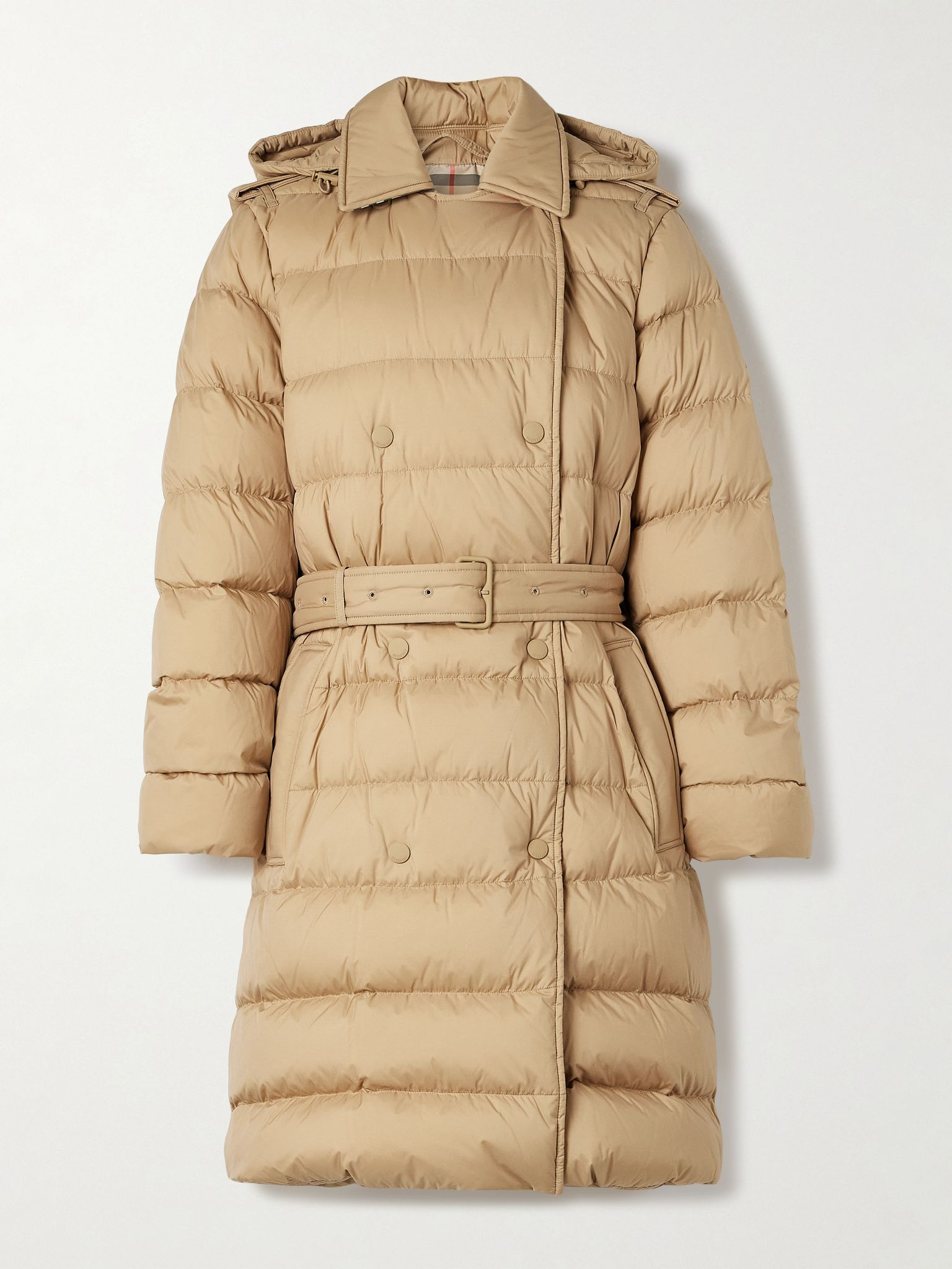 Burberry elevates classic puffer coats with this double-breasted design. Made from quilted shell, it's filled with down for warmth and has a coordinating belt to define the shape. Pop the collar to show off the checked underside. Size & Fit - Fits true to size, take your normal size - Designed for a slightly loose fit, use the tie belt to cinch in at the waist - Quilted, non-stretchy fabric - Model is 175cm/ 5'9" and is wearing a size Small Model measurements: - Bust: 79cm/ 31” - Waist: 61cm/ 24” - Hip: 88cm/ 34.5” Details & Care - Sand shell - Snap fastenings through double-breasted front - 100% polyamide; filling: 90% down, 10% feathers (Goose); lining: 100% polyamide - Fully lined - Machine wash