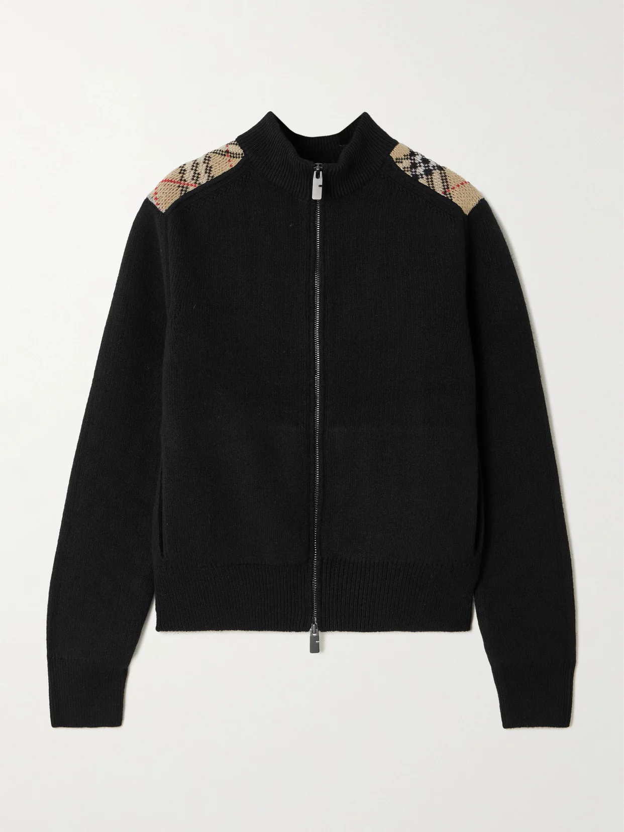 Burberry's cardigan has been knitted in the United Kingdom from sumptuous wool and cashmere-blend. Contrasted with iconic checked shoulder panels, it has a modern turtleneck and subtle side pockets.