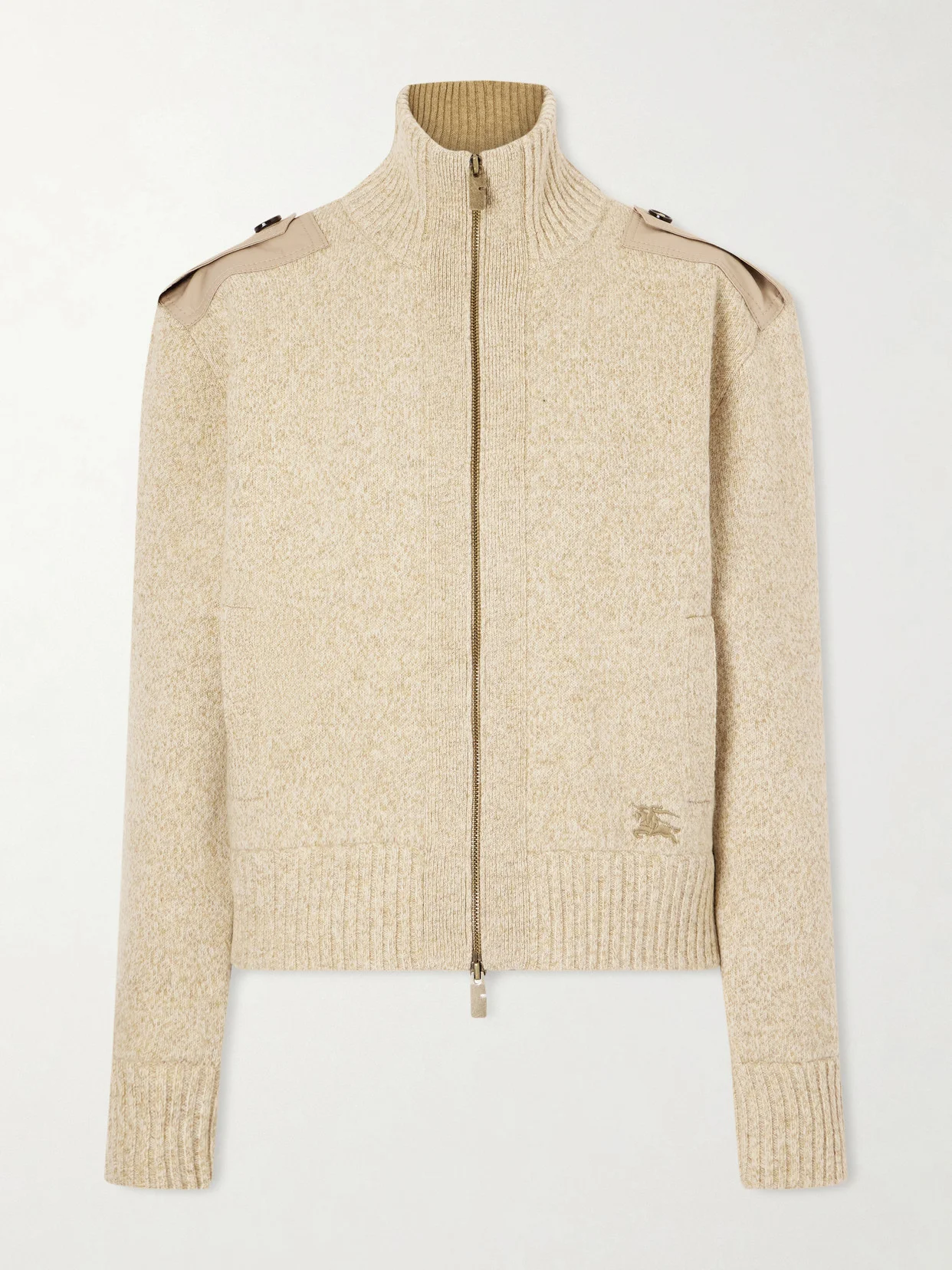 Burberry's zip-up cardigan references the brand's rich heritage with trench-inspired gabardine epaulettes at the shoulders. It's knitted from double-faced wool-blend for a regular fit and has a chunky funnel neck and ribbed trims. The embroidered 'Equestrian Knight' logo sits at the hip.