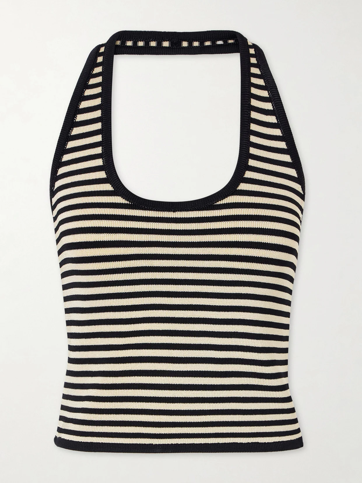 Calle Del Mar's top is knitted in the USA with striking black stripes and shaped in a flattering halterneck silhouette. Style it with the matching shorts from our edit.