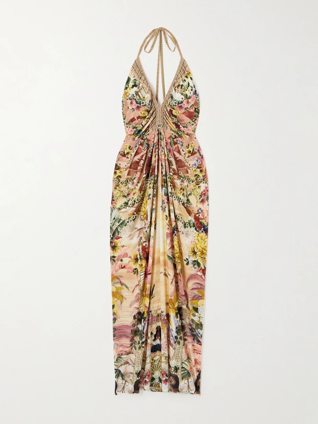 Camilla's collection with The White Lotus is designed in collaboration with artist Lezio Lopes, who is responsible for the show's iconic opening credits. Printed with a lush Hawaiian landscape inspired by season one, this maxi dress is cut from slinky silk-jersey and gathered at the crystal-embellished V-neckline.