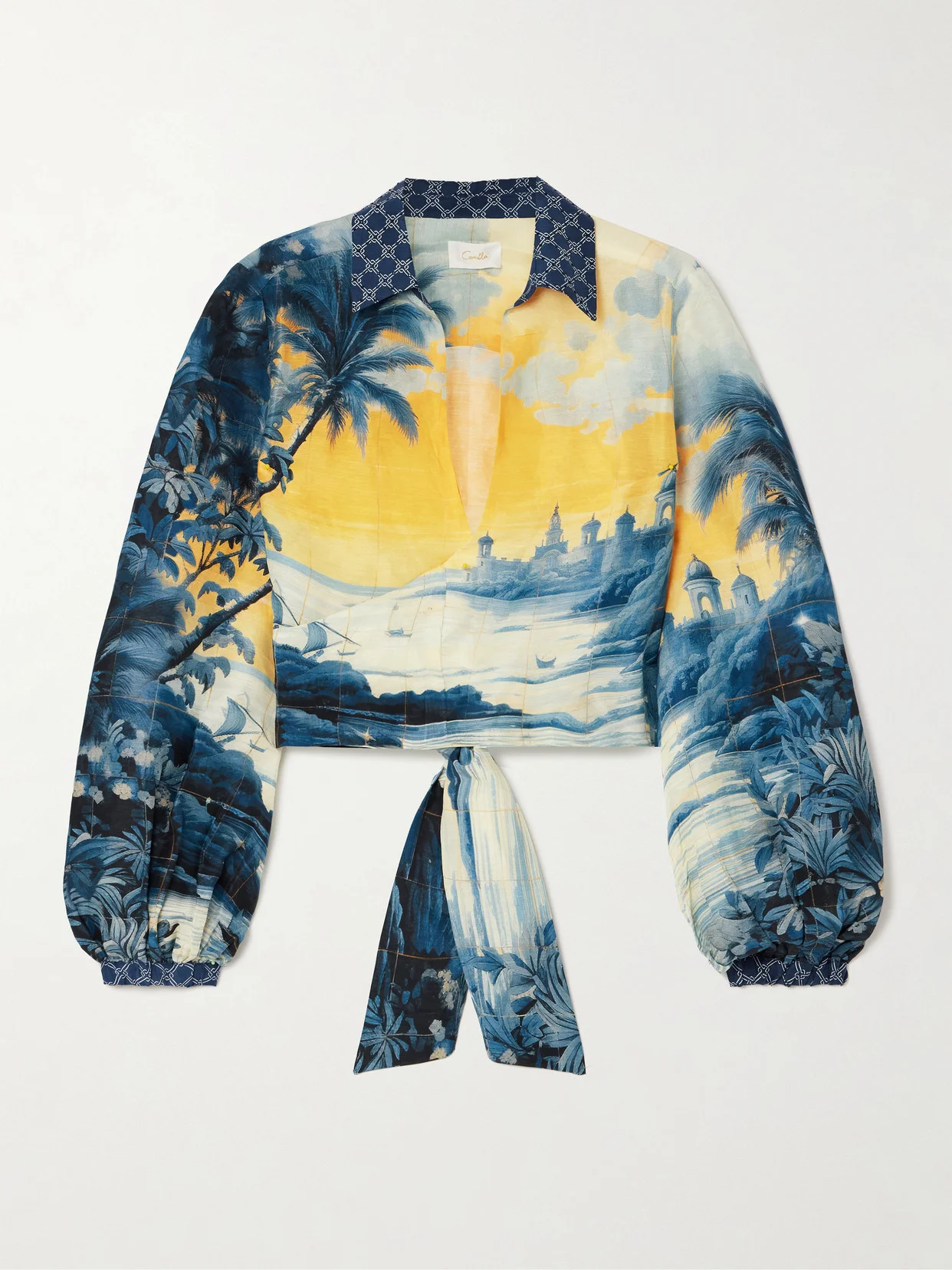 Camilla's wrap shirt is printed with a 'Song of Saint Anthony' pattern - a picturesque illustration inspired by the Lisbon festival honoring treasures of the sea. It's crafted from linen and silk-blend and has billowing blouson sleeves. Complement the crystal sparkles with diamond earrings.